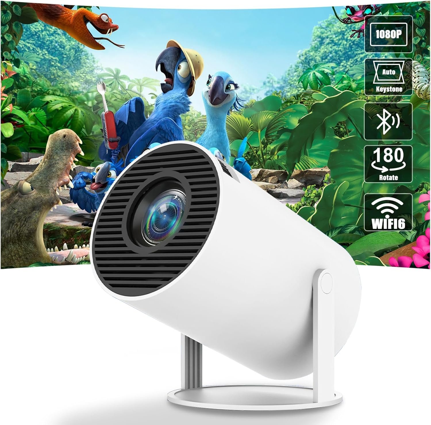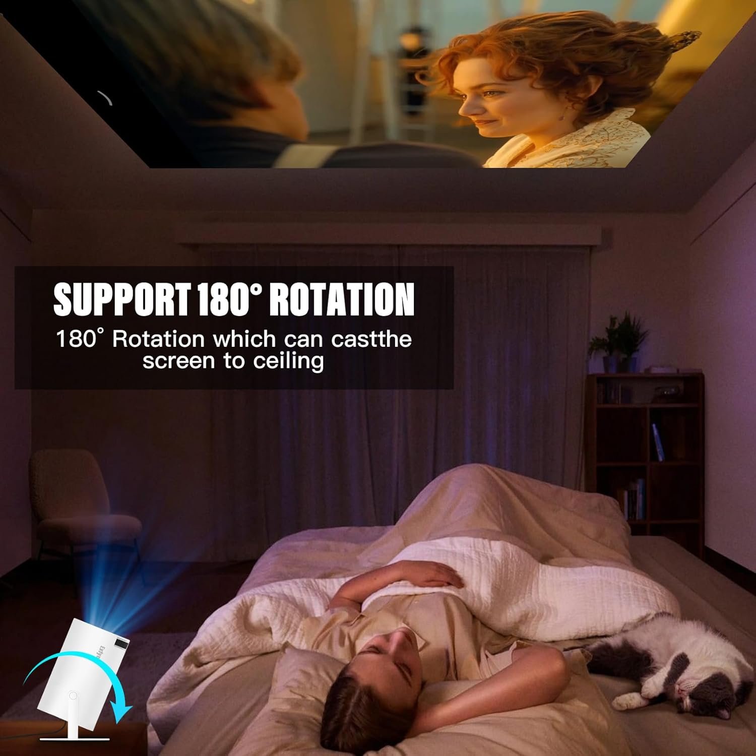 【180° Rotatable Wall Projector】This smart portable projector features 180° rotatable design. You can point the projector at the ceiling of your bedroom, lie on your bed and watch a film, or any other direction. Portable size, 12,000 lumens and up to 50,000 hours of light source life.