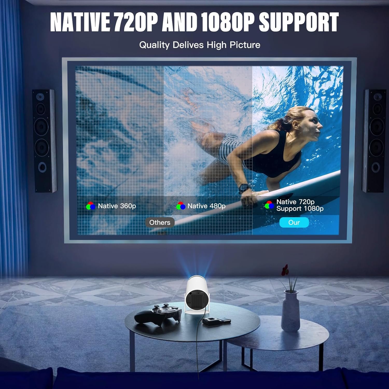 【Video Mini projector】This projector for bedroom has native HD clarity, 1280*720P Wifi projector. It features colour calibration and adjustment technology that reproduces more complex colour details than other mini projectors, giving you sharper, brighter and richer HD images for nighttime viewing of Full HD movies and TV shows.