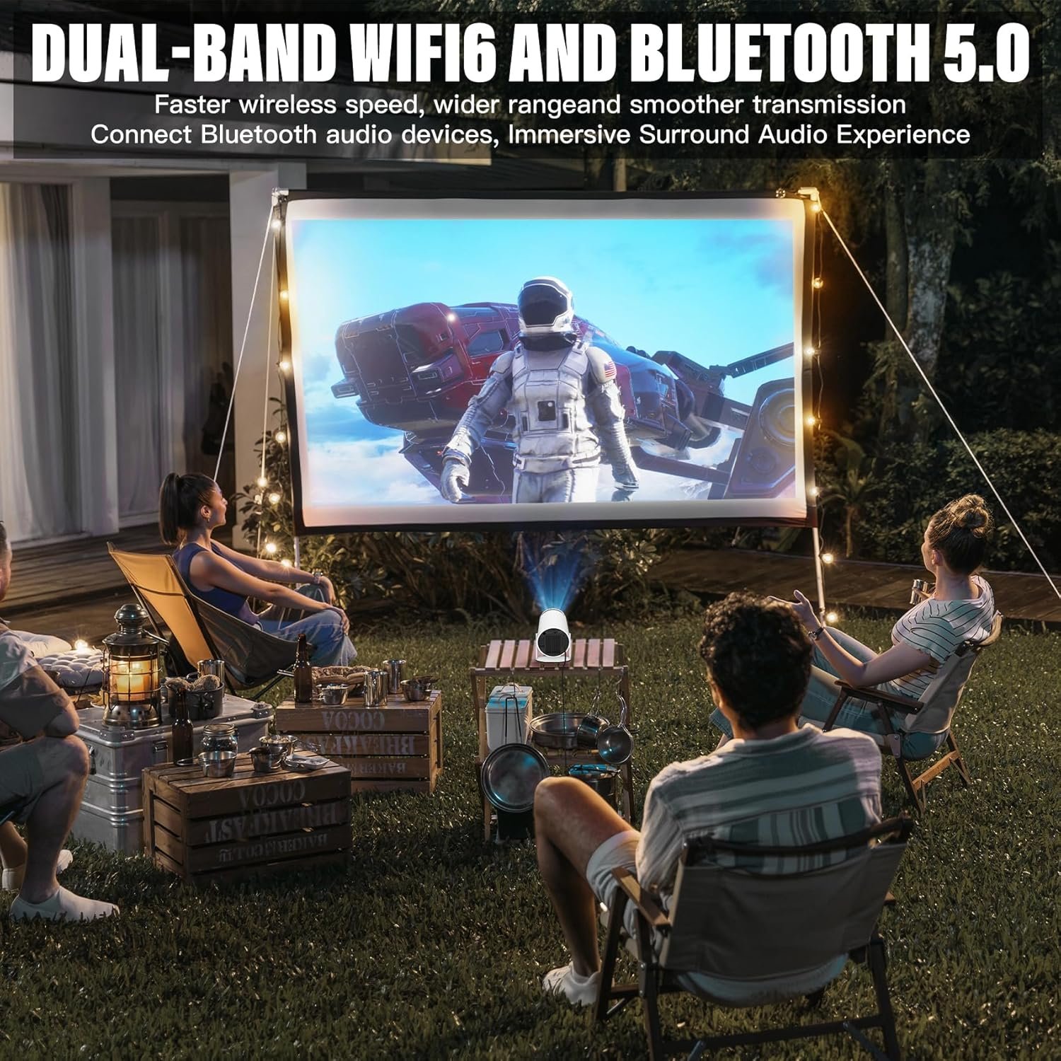【Projector with Wifi and Bluetooth】This portable projector comes with built-in dual-band WiFi6 and Bluetooth 5.0 technology for faster and more stable audio and image synchronisation, providing you with the best audio-visual experience. Meanwhile, the Bluetooth projector has built-in upgraded speakers.
