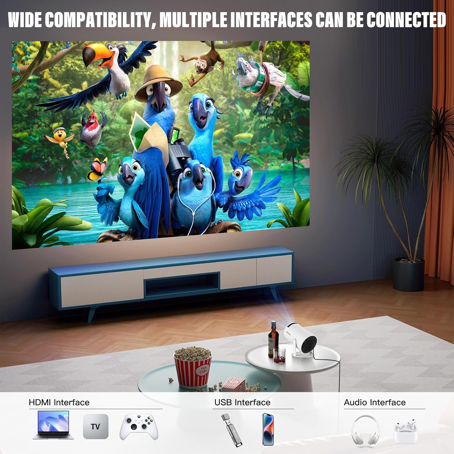 【Wide Connectivity Availability】With built-in HDMI, USB, AC, and headphone jacks, this portable projector is the perfect solution for a wide range of input sources including, but not limited to, games, PCs, smartphones, tablets, laptops, and USB sticks. The projector with wifi and bluetooth can be directly controlled by remote control, making it easier to use and more cost-effective.