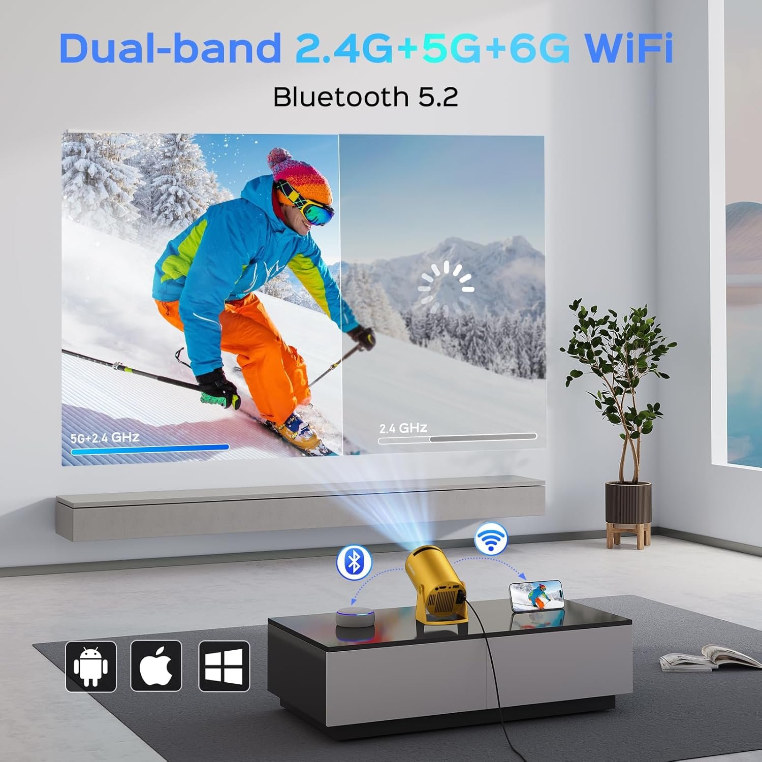 【Built-in Android 11 & Dual-Band WiFi 6】: Experience seamless entertainment with our smart projector, featuring a built-in Android 11 operating system for instant access to a vast array of content without needing extra devices. Stay ahead with the latest tech and software updates, ensuring future compatibility. This small projector built-in dual-band 2.4/5G WiFi 6 ensures reduced latency and enhanced responsiveness, perfect for video conferencing and real-time applications, delivering smoother, more immersive experiences.