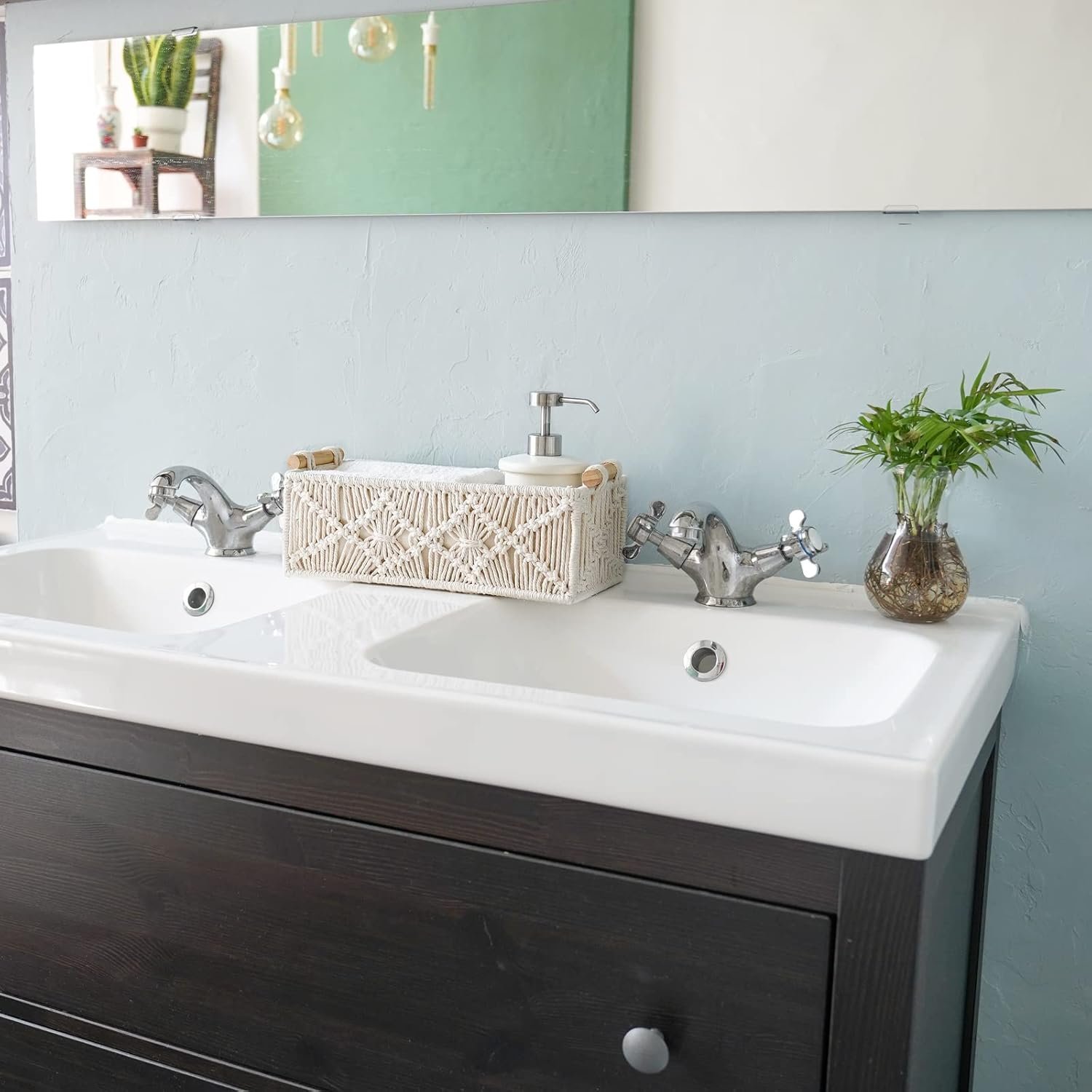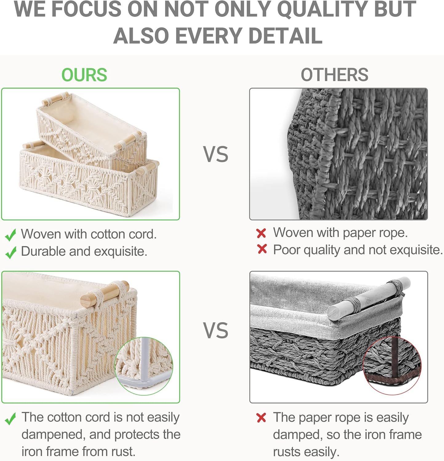 Customers appreciate the baskets for their style, build quality, and size. They find the outer macrame weaving beautiful and the wooden handles a nice touch. The baskets are sturdy and fit well in narrow spaces like bathrooms. They organize toiletries and keep clutter at bay. Customers also appreciate the value for money and functionality of these baskets.