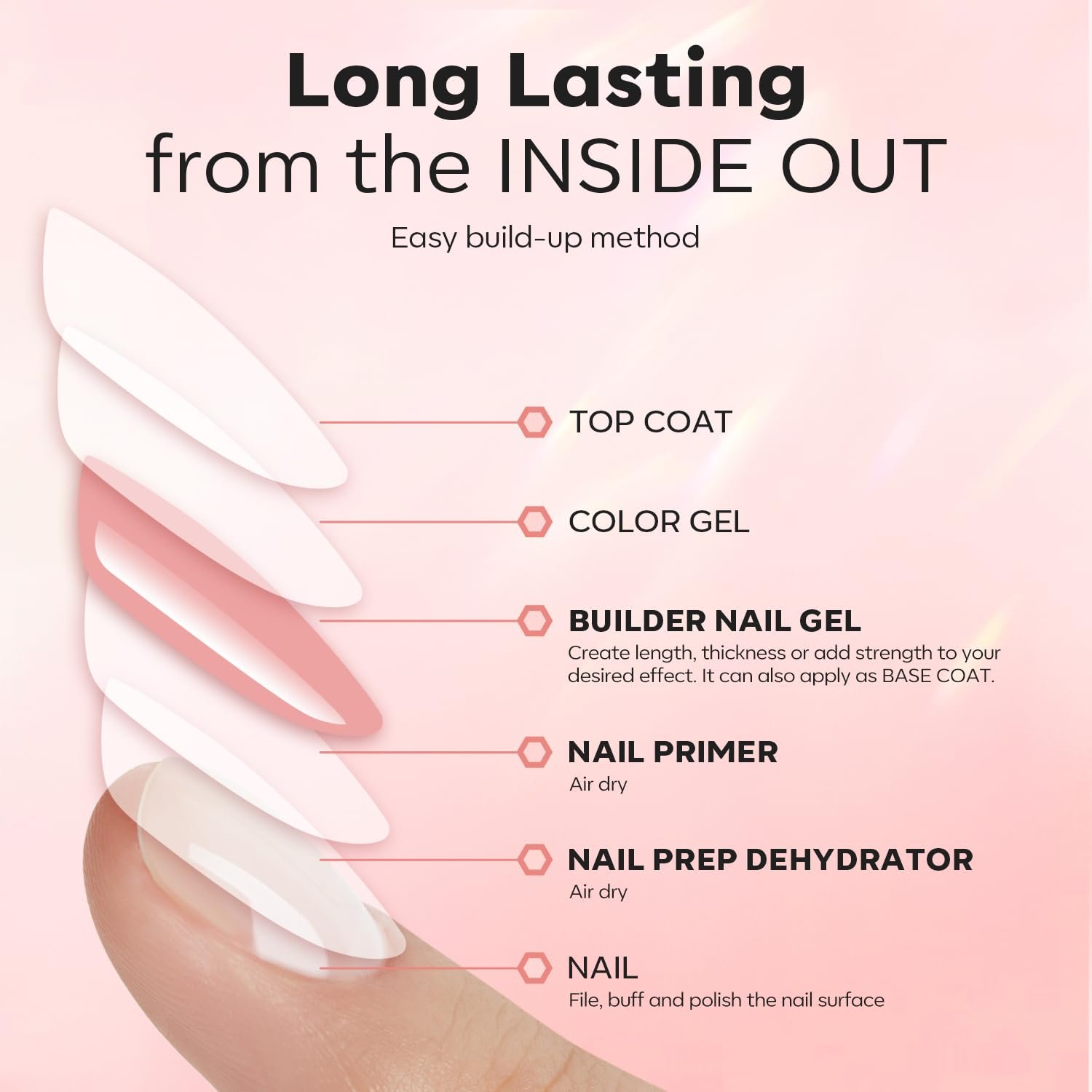 Quick & Easy Application: High self-leveling formula along with built-in brush makes it easy to spread, help you create length, thickness or add strength to the nail you want, and ensure a smooth and natural nail foundation layer with impeccable shine. NOTE: It is normal for builder nail gel to remain a little sticky after curing, which will make a better adhesion between nails and gel layers. It is recommended to use top coat to seal it