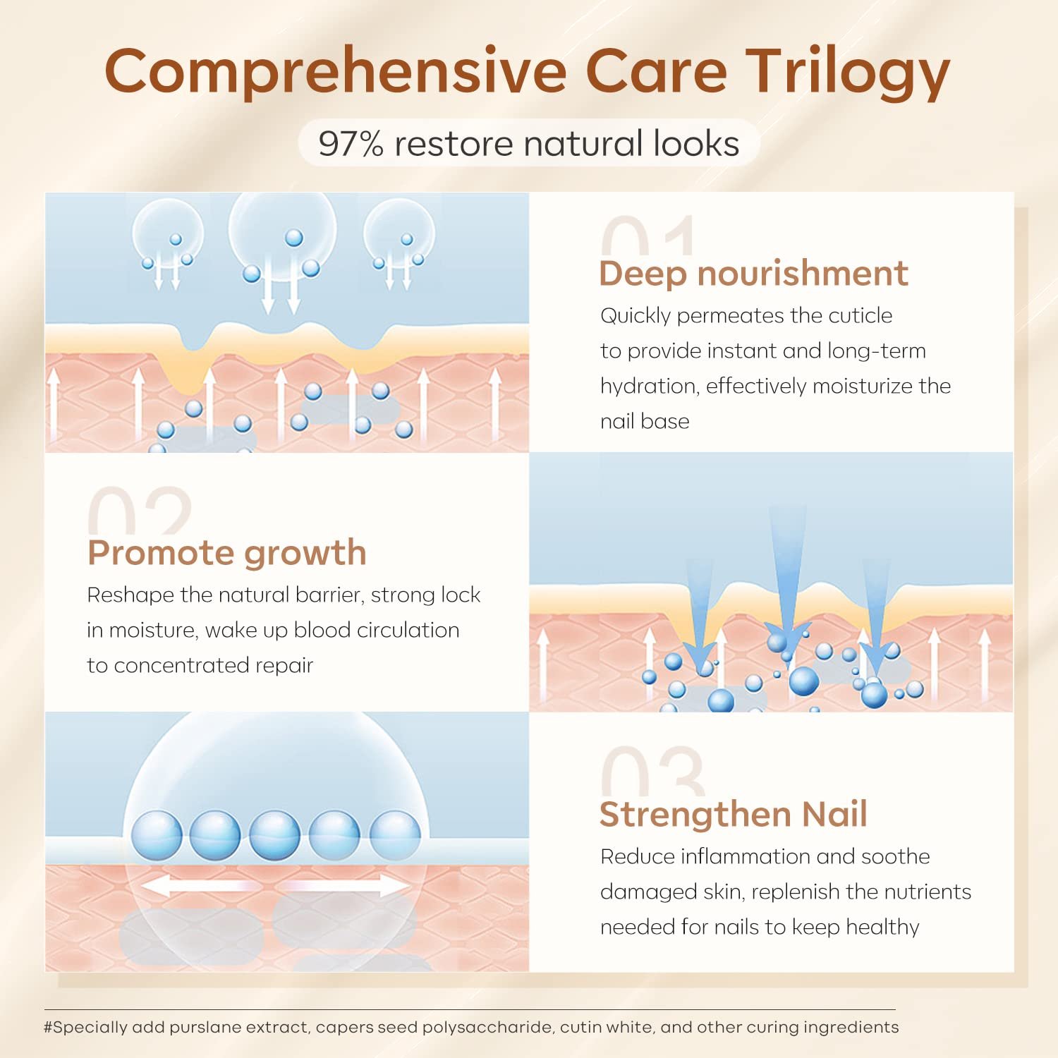 【Pure Organic Ingredients】The key ingredients are Glycerin, Jojoba oil, Macadamia Ternifolia seed oil and Vitamin E. These natural oils are excellent for moisturizing and relief cuticle to reduce dry cuticles, hangnails. Portulaca Oleracea Extract is specially added to this nail repair cream, which gives super power to cuticle growth, making nails and cuticles stronger. It is our must-have daily nail care products.