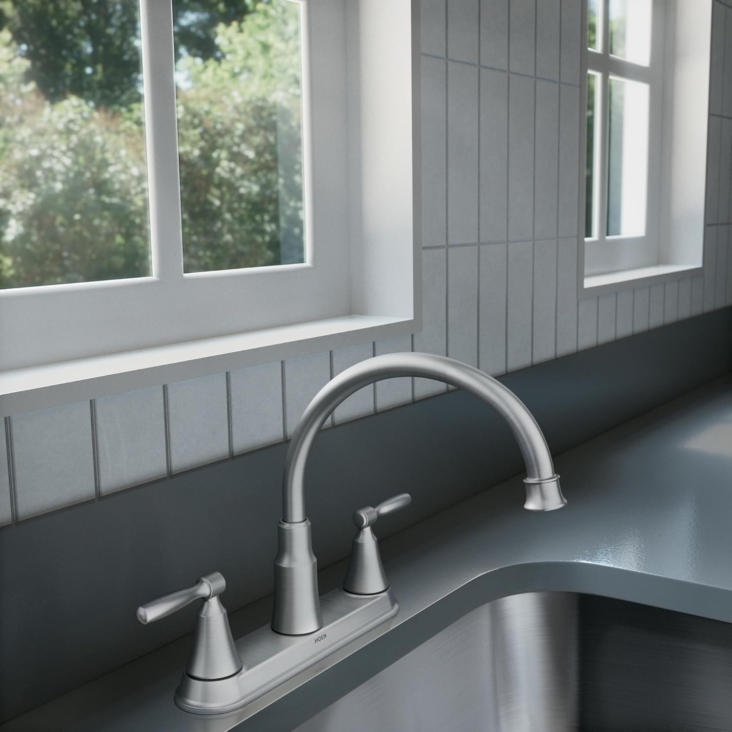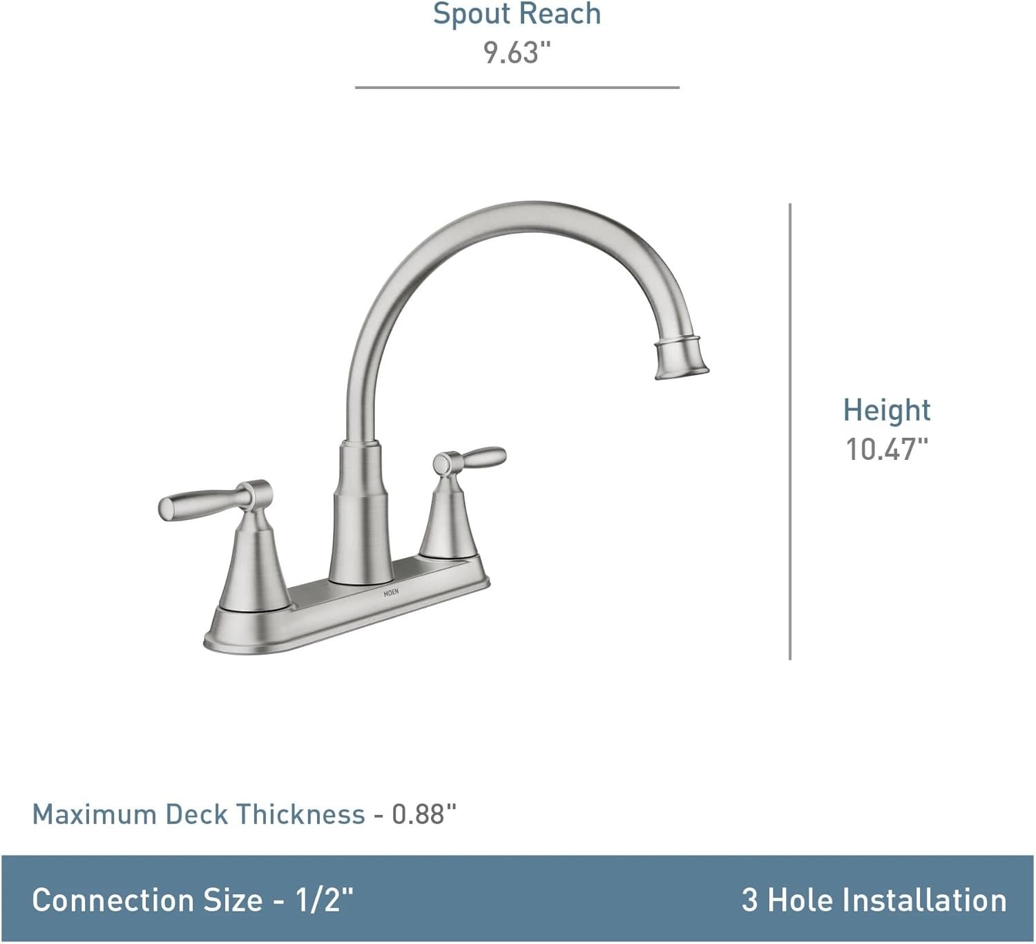 A high arc with classic details and delicate Traditional features are what sets the Hutchinson two-handle kitchen faucet apart. The faucet stays looking cleaner, longer with Moen’s exclusive Spot Resit finish, which resists fingerprints and water spots to maintain the brilliance of the fixture. With more than half of homeowners preferring a Traditional style in the kitchen, Hutchinson is the perfect choice for a distinguished design.
