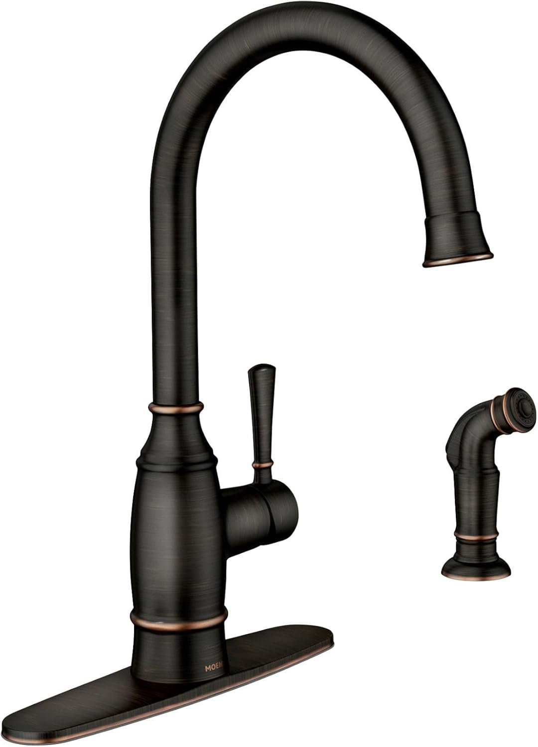 The Moen Noell 1-Handle Kitchen Faucet was designed with attention to detail. The Noell collection embodies elaborate Traditional designs to enhance the style and design of any home. This faucet includes a side spray hose for convenient, flexible cleaning at the sink.