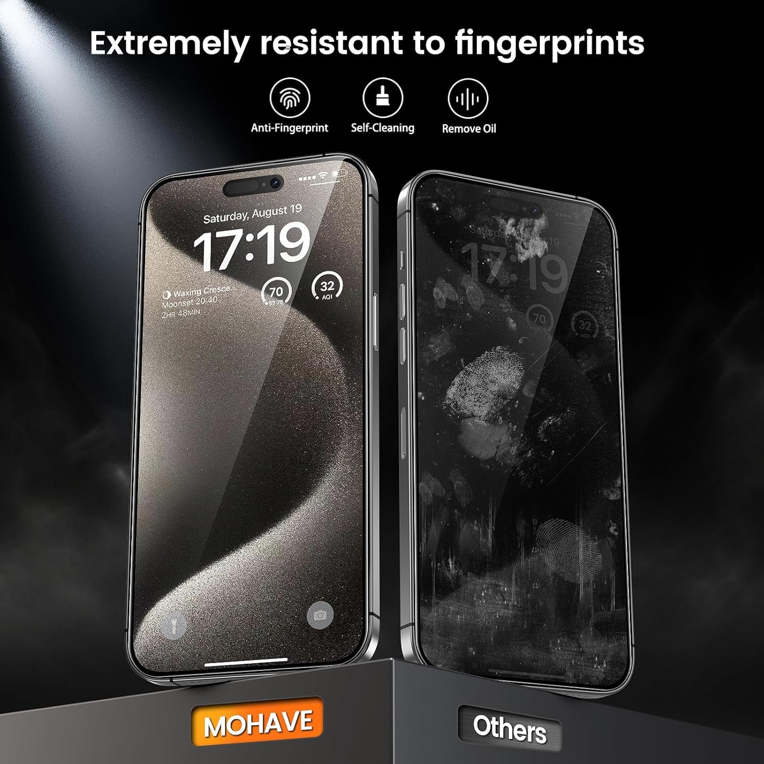 ★【Smudge-proof & Sensitive Touch】 MOHAVE iPhone 15 Pro Max tempered glass screen protector adopts the advanced electroplated oleophobic coating hugely reduce smudges and fingerprints, touch smooth as silk, feels better than the bare screen.