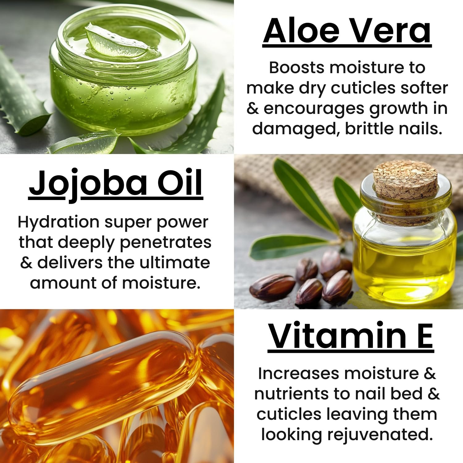 Jojoba oil deeply penetrates & absorbs into the skin, helping to repair damaged collagen so cuticles can stay hydrated & nails can grow long & strong.