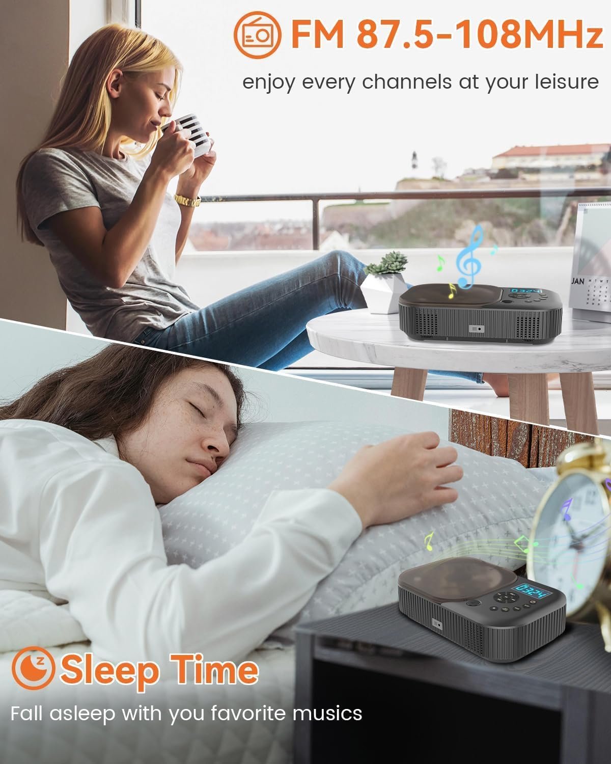 【5 playback modes】The CD player has an LCD screen, which allows you to conveniently select 5 modes (CD/Bluetooth/FM/AUX/USB). Supports programmed playback, 20 CD songs/99 MP3 or WMA songs. CD player mode switching is simple and easy to understand, and you can switch randomly with just one click. Radio frequency is 87.5MHz-108MHz. Whether in the car or at home, you can listen to music, news, etc. from various channels