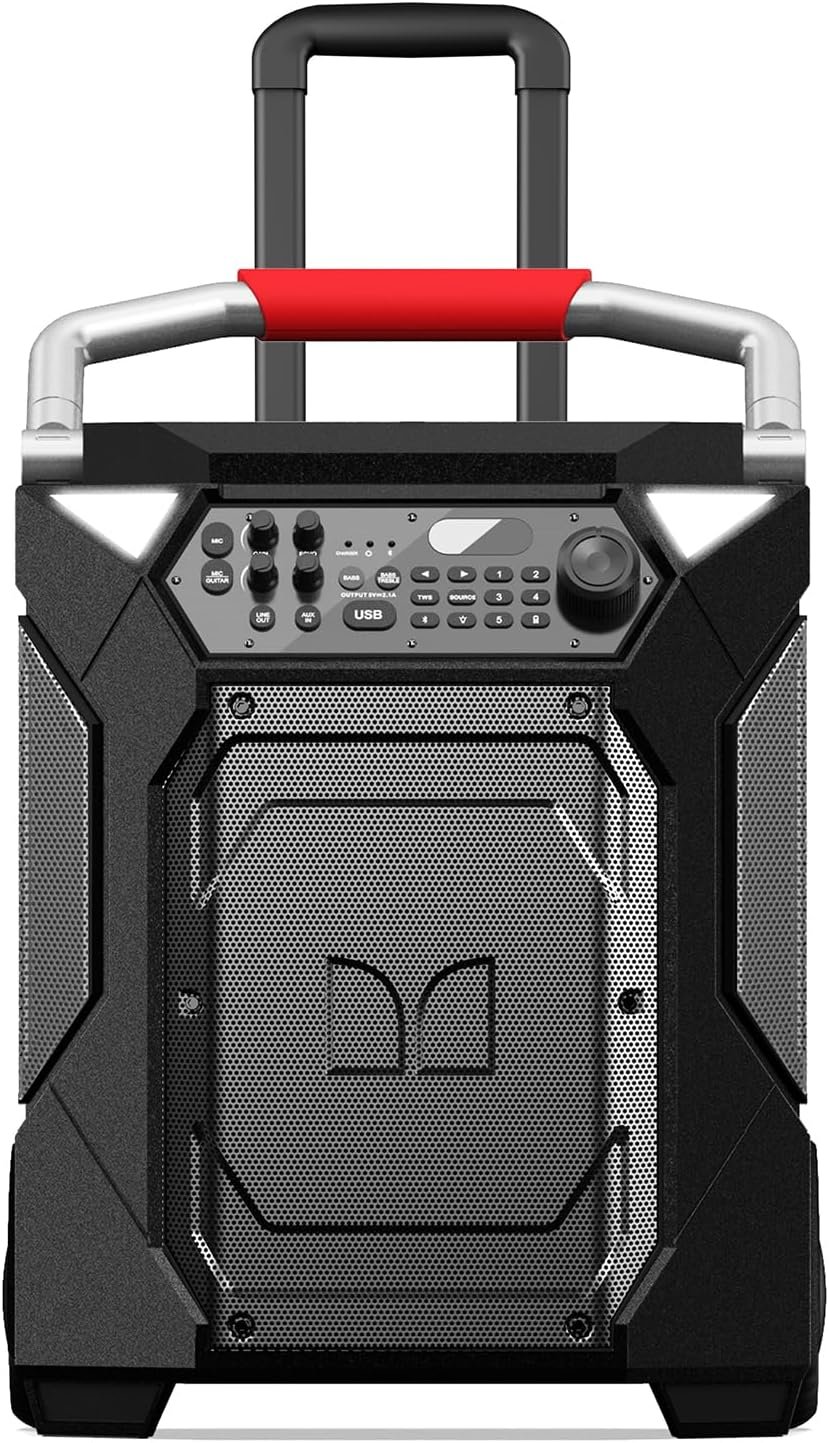 THE COMPLETE PACKAGE: Rugged oversized 5″ wheels, to help with rough terrain. Adjustable top handle to allow for a phone or tablet to position upright. Built-in LED lighting to help view the controls as the lights go down and a telescoping handle for transportation. The Monster Rockin’ Roller 360 also features QI Wireless charger, a USB port, and includes a microphone for Karaoke/PA Speaker use.