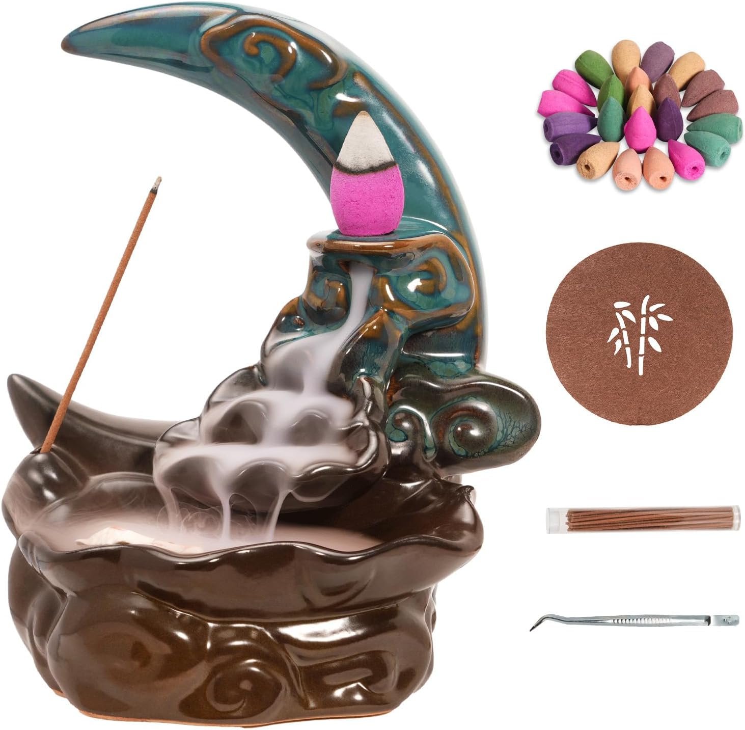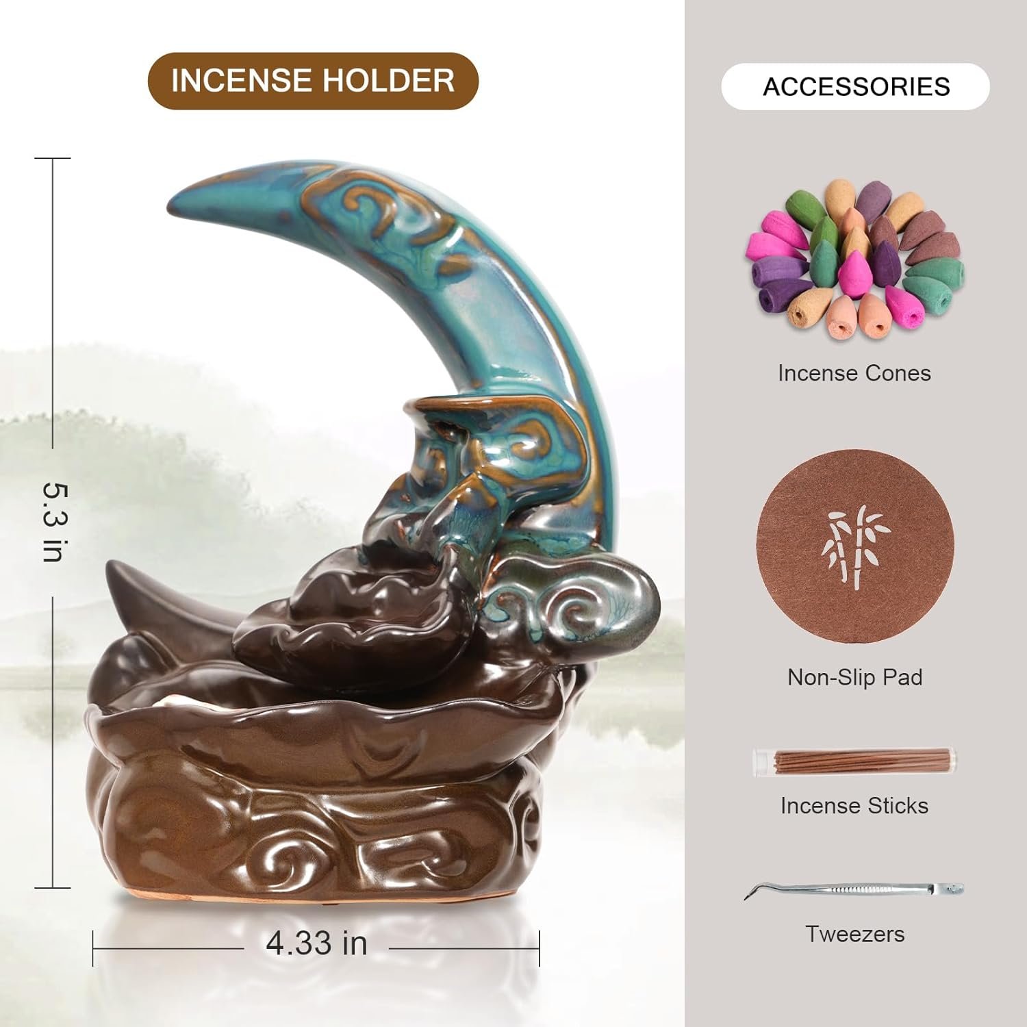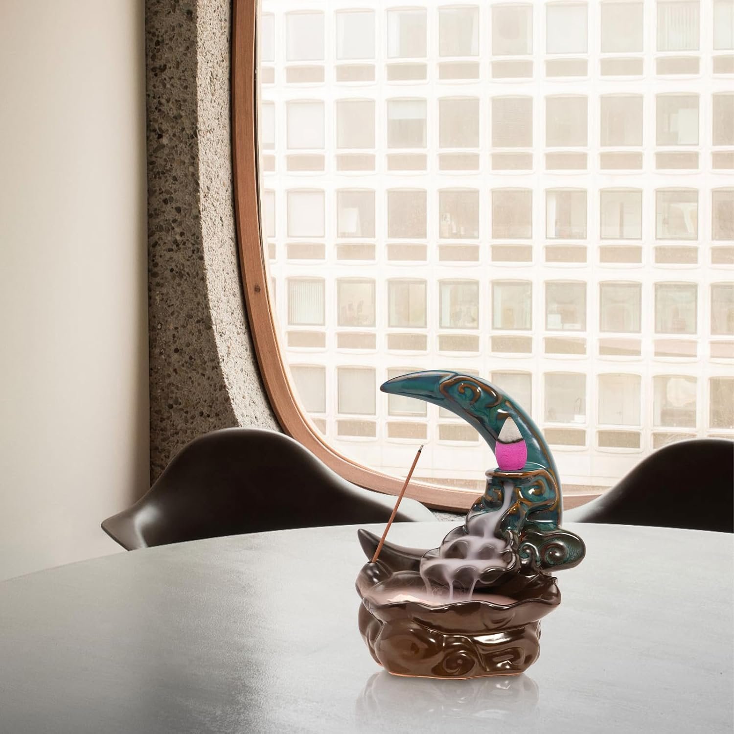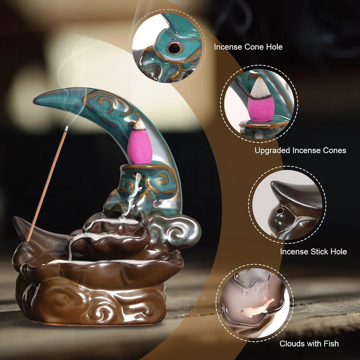 🌙Moon-shaped Incense Burner: The ceramic waterfall incense holders are hand crafted. The incense cones and sticks can be used separately or simultaneously to release fragrance. When backflow cones are burned, the smoke produced will come down from above, helping to show the visual effect similar to the natural fountain waterfall.