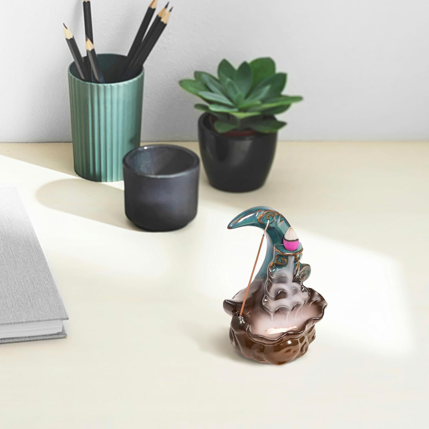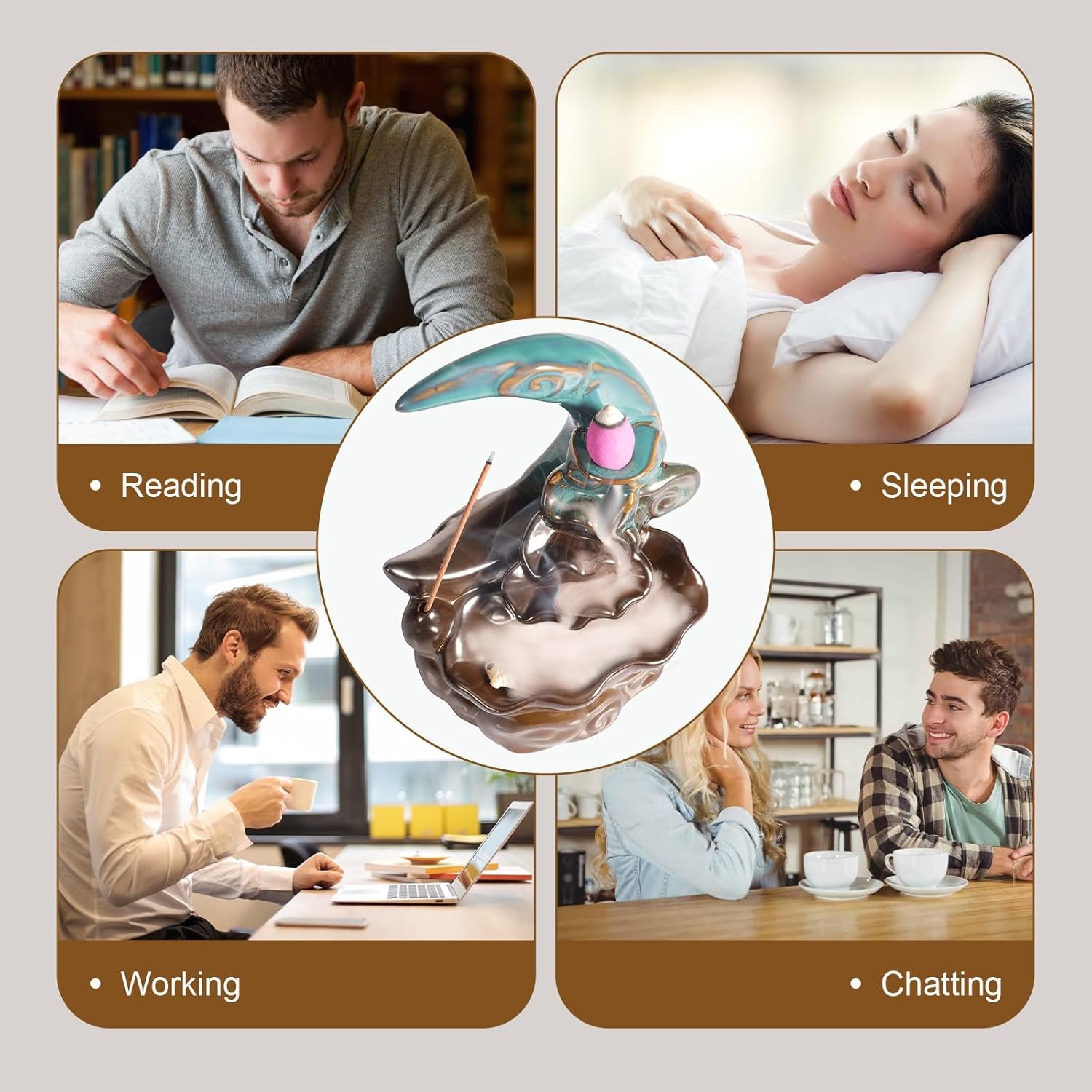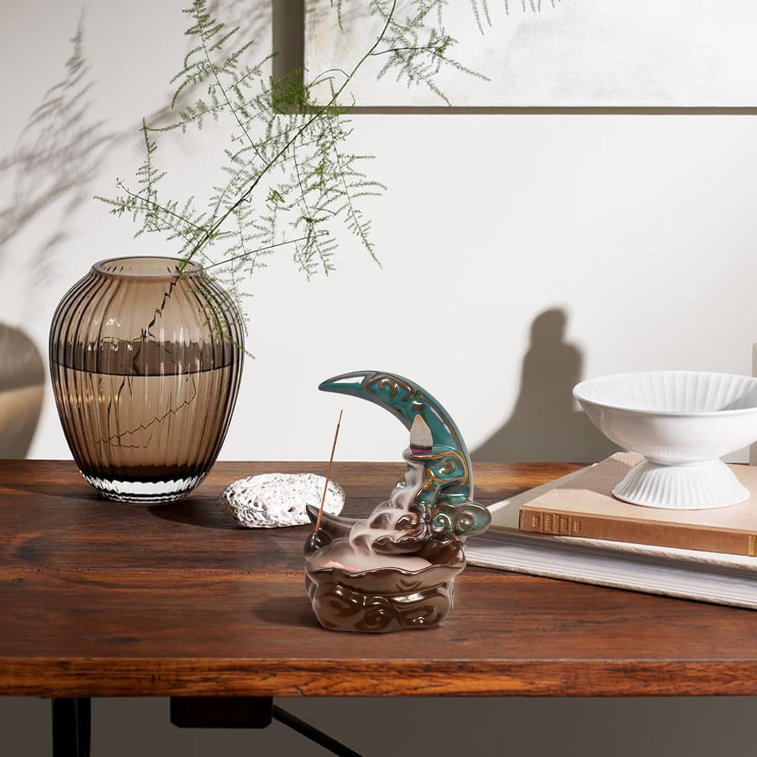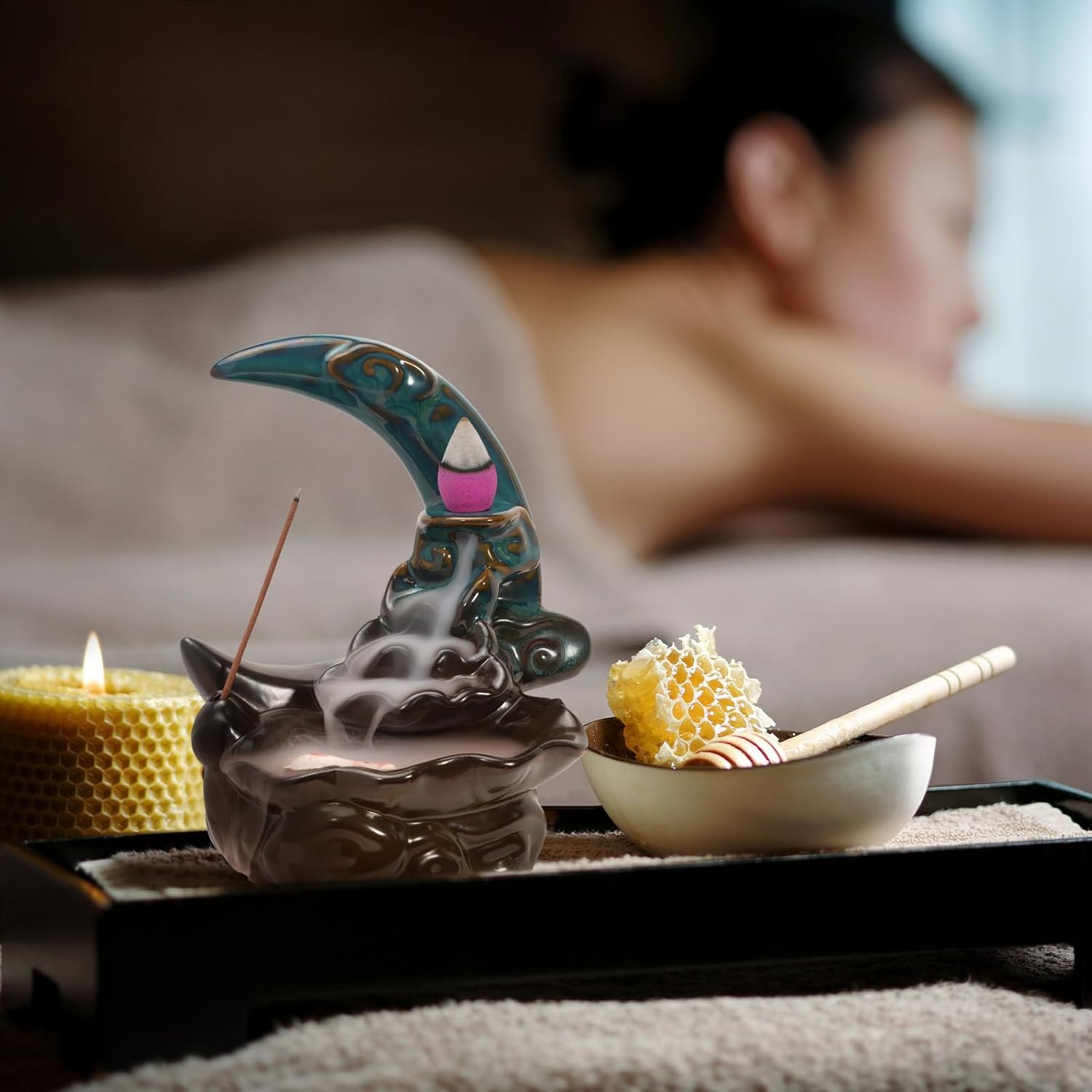🌙Moon-shaped Incense Burner: The ceramic waterfall incense holders are hand crafted. The incense cones and sticks can be used separately or simultaneously to release fragrance. When backflow cones are burned, the smoke produced will come down from above, helping to show the visual effect similar to the natural fountain waterfall.