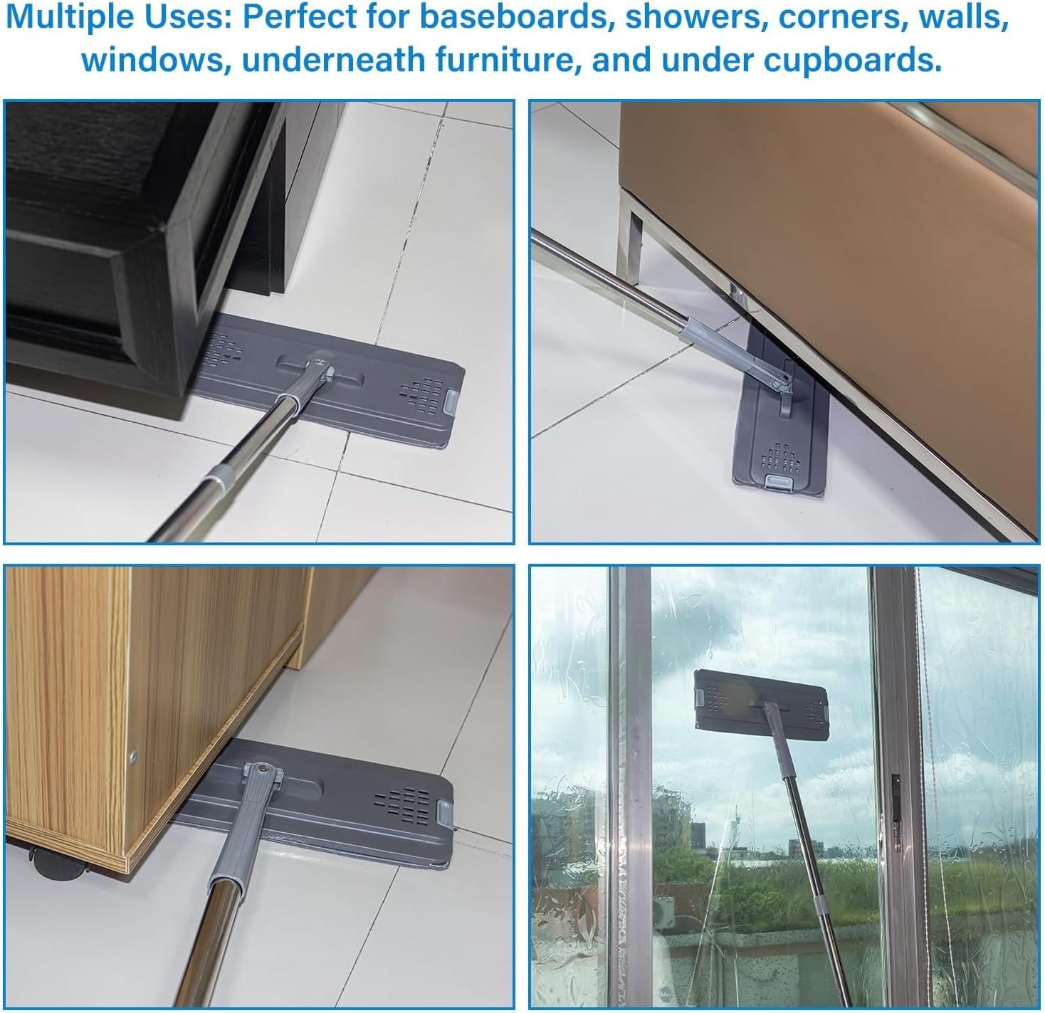 【Never Leave Any Corners】:Rotate the mop head 360°, you can reach any corner and those “whatever” places. With an adjustable stainless steel handle that extends from 26.5 to 50.0 inches, mop the floor with your family with this cleaning household mop.