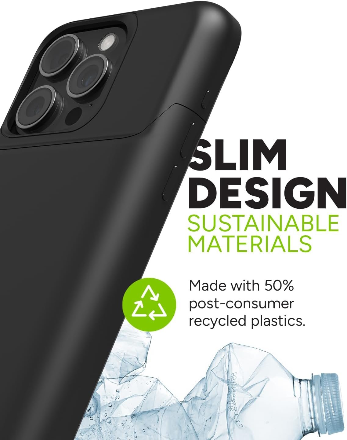 Welcome to the new era of power and protection with the mophie juice pack for iPhone 15 Pro Max. This iconic battery case has been reimagined to bring legendary performance and durability to your daily life, ensuring your device is always ready for action. With the mophie juice pack, you’re not just choosing extended battery life; you’re embracing a legacy of reliability that mophie has cultivated over the years. The juice pack offers a significant boost of up to 50% extra battery life thanks to its 3,000mAh capacity, ensuring your iPhone 15 Pro Max remains powered through every call, message, and moment. Its slim, protective design provides up to 6 feet of drop protection, safeguarding your device from the unexpected. With the inclusion of priority charging, your iPhone’s battery takes precedence, receiving power first before the case recharges. The versatile USB-C port enhances your charging options, providing seamless integration with your digital lifestyle. Does Not Support Magsafe or Wireless Charging. Cable not included. Beyond its performance, the mophie juice pack is a testament to sustainable innovation, constructed with up to 50% recycled plastic. This commitment to eco-friendliness means you’re not just protecting your phone; you’re also making a choice that benefits the environment. Rediscover the convenience, power, and protection that mophie is known for, now upgraded for the iPhone 15 Pro Max. The juice pack isn’t just a battery case; it’s a mobile lifestyle upgrade, designed to keep you connected, protected, and environmentally conscious.