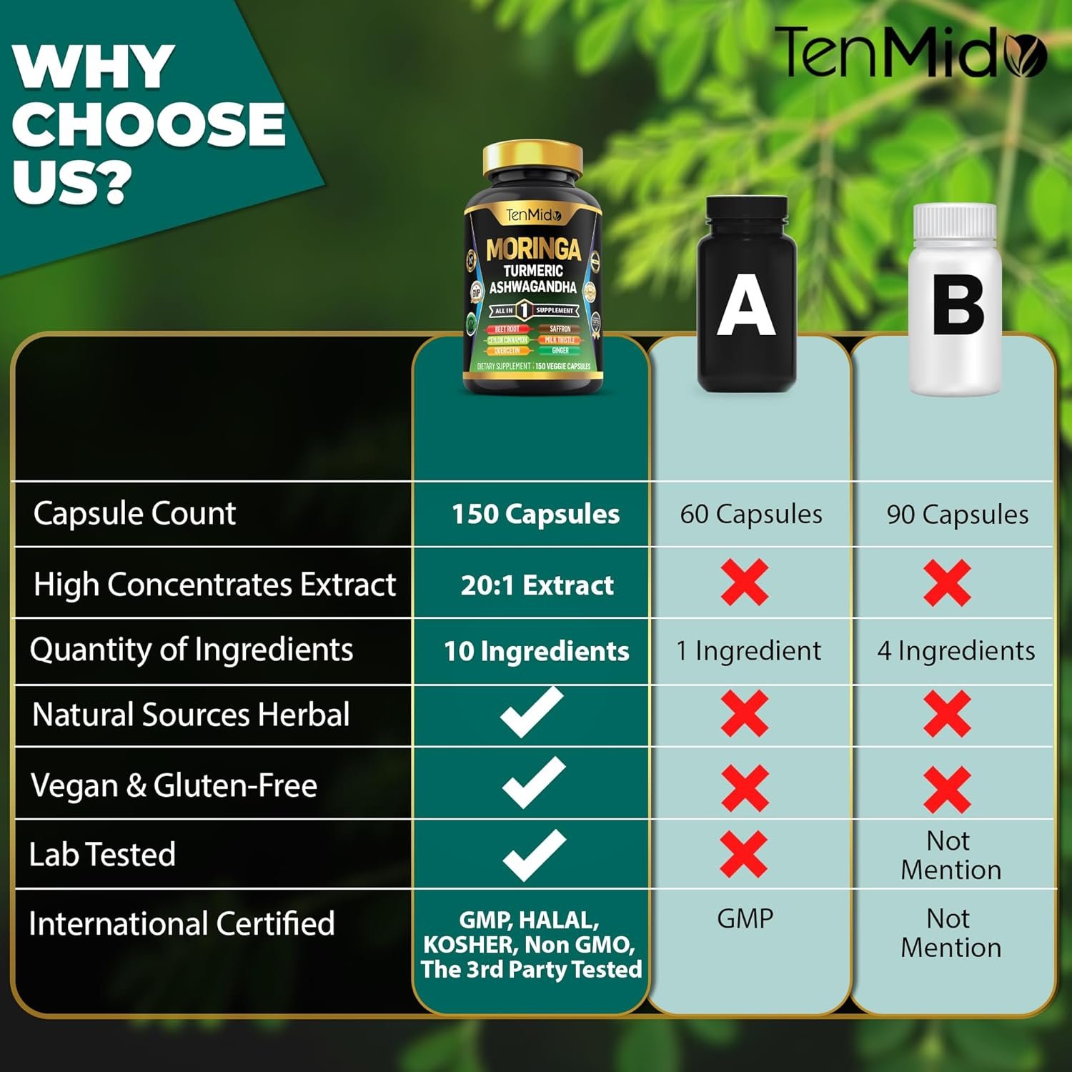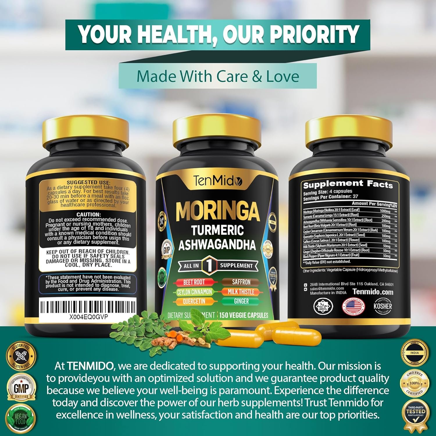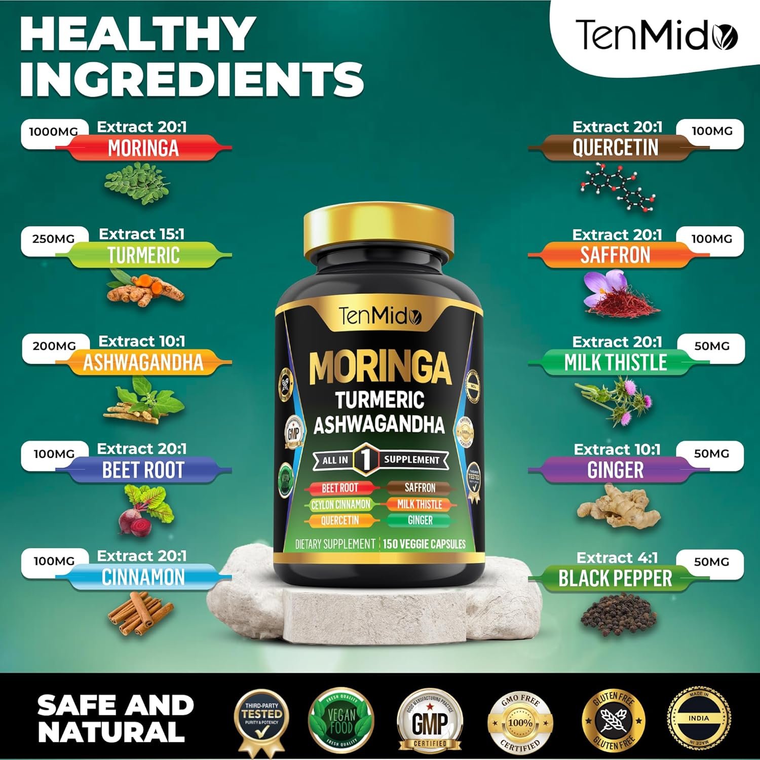 Advanced Formula with a comprehensive combination of Moringa, Turmeric, Ashwagandha, Beet Root, Cinnamon, Quercetin, Saffron, Milk Thistle, Ginger, and Black Pepper for Women and Men. Tenmido has developed a potent all-in-one supplement, enriched with 10 potent ingredients. This concentrated moringa extract presents a rich blend of nutrients, provides comprehensive reinforcement for human function and overall health.