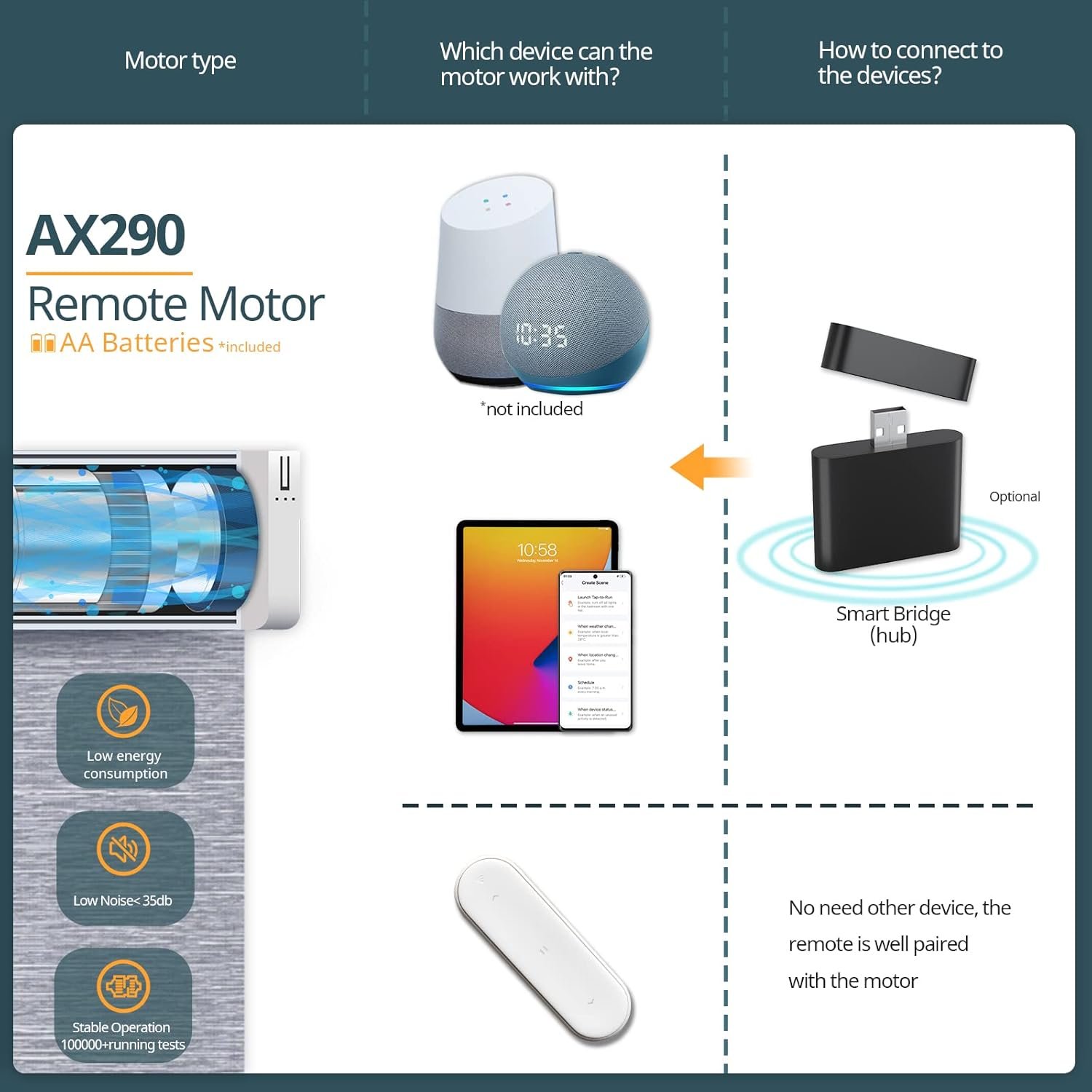 SMART IMPLEMENTATION: The AX290 motor requires a smart bridge for APP control/voice control, which requires a hub at home, and you may try our hub. All models of Alexa and Google Assistant can be used to control motorized window shades, and can set timers and other scenes.