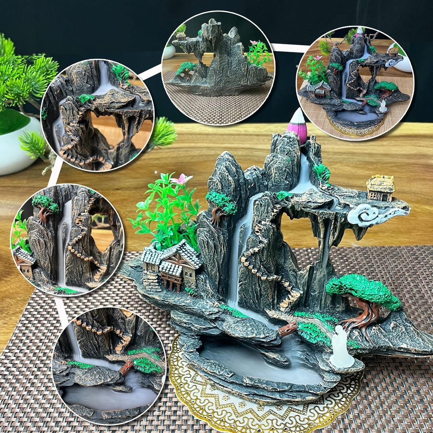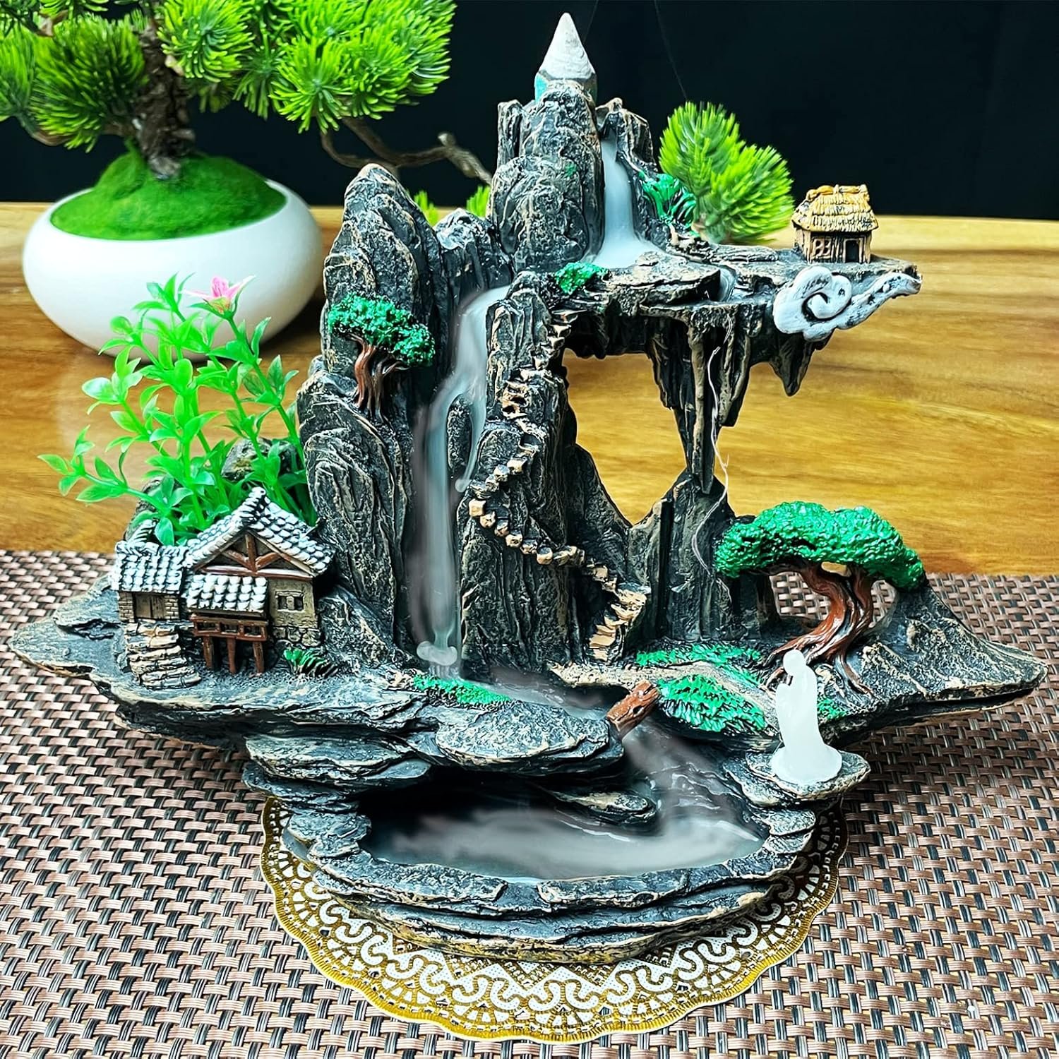 💟【Fashion Design】:Our backflow incense burner is made of environmentally friendly resin, hand-carved, with a novel and unique design. When used, it produces smoke, like waterfalls and clouds, surrounding the incense holder.
