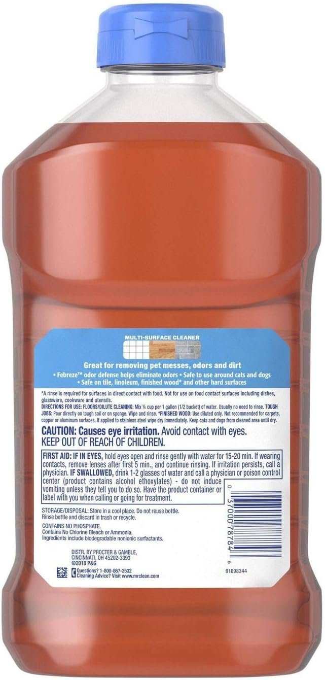 Clean your home and enjoy the scent of Febreze Odor Defense. Mr. Clean’s Multi Purpose Pet Liquid Cleaner with Febreze Odor Defense not only has the muscle to cut through dirt, grease, and grime but also cuts through 100% pet messes, odor, and dirt. It works to help pet owners tackle tough messes while odor converters trap and help climate odor. This multi-surface cleaner works all around the house on everything from linoleum, to tile & finished hardwood floors*, to toilets and bathtubs. Outside, this multi-surface cleaner is perfect for garbage cans, doors and more. Mr. Clean Multi Purpose Pet Liquid Cleaner is great for use on sinks, counters, stoves and more. No matter the mess, we’re sure you’ll find that this great performance and great scent combo will make your cleaning routine a little less routine. *Use diluted in room temperature water only. Packaging May Vary