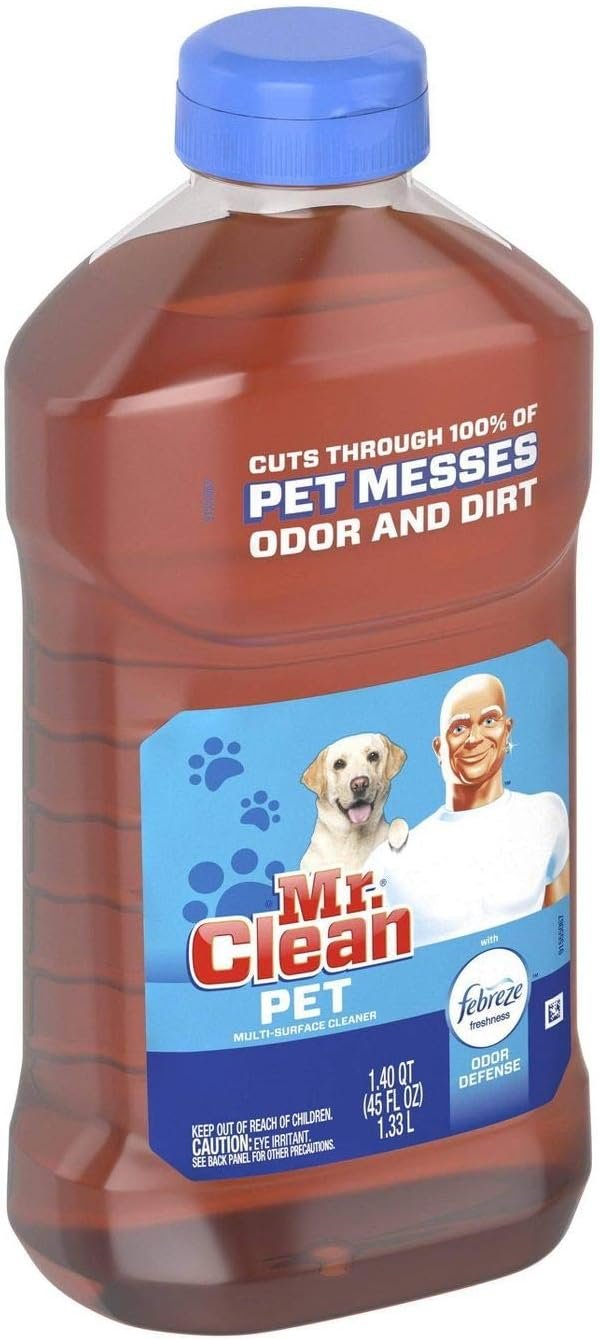 Mr. Clean’s Multi Purpose Pet Liquid Cleaner with Febreze Odor Defense not only has the muscle to cut through dirt, grease, and grime but also cuts through 100% pet messes, odor, and dirt.