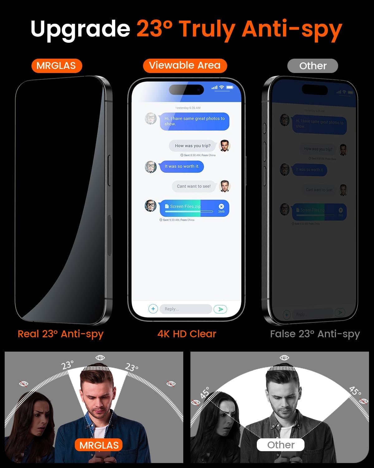 [Excellent Privacy Protection]MRGLAS iPhone 15 Pro Max privacy screen protector achieve 23° super powerful privacy function. When you’re in an elevator, subway, bank or other public place, block the view which trying to view your secrets from both sides. Your friends or coworkers sitting next to you won’t be able to see your information, providing the strongest protection for your privacy and sensitive information.