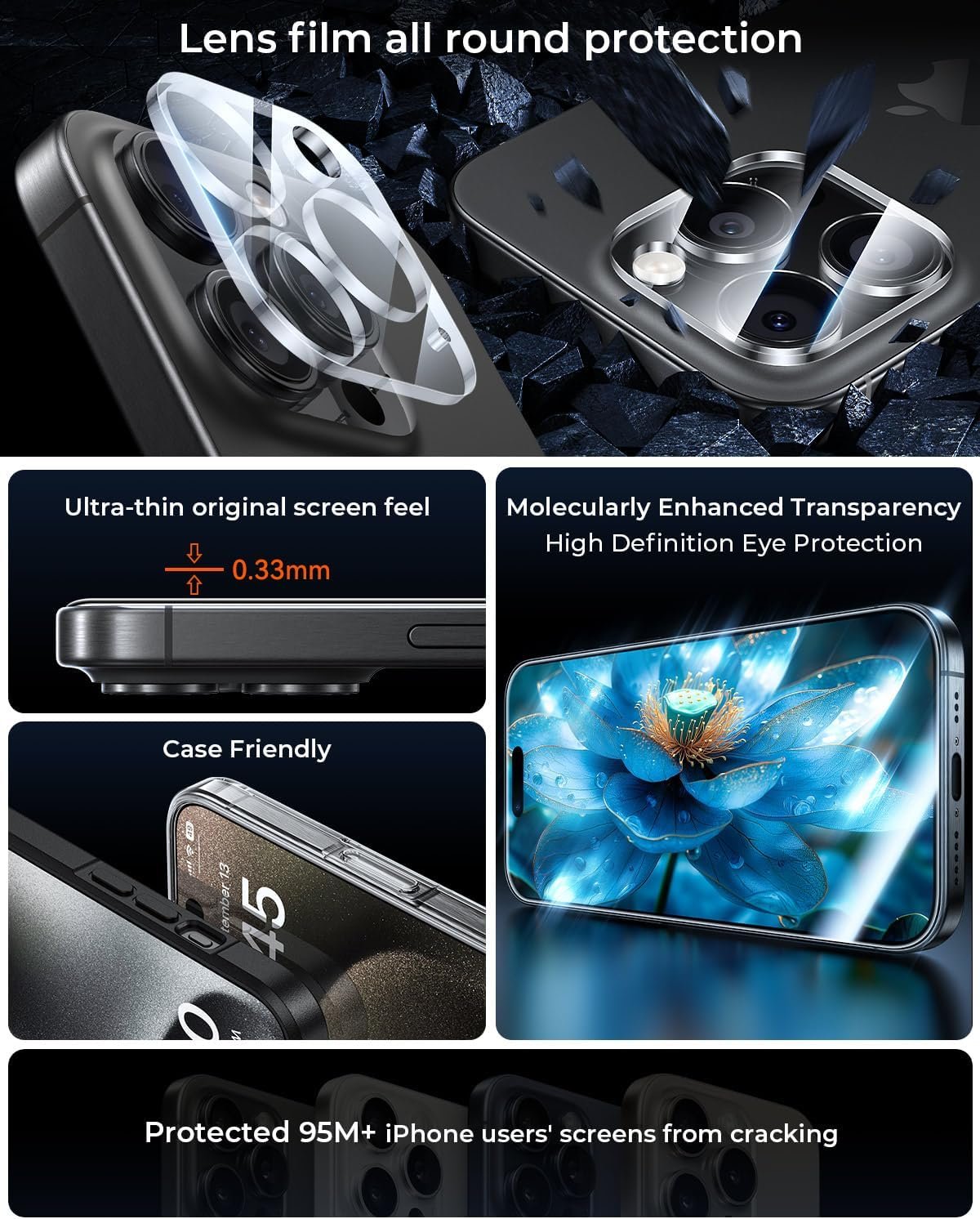 [AR Technology And Night Shooting Function] Camera lens protector are designed for iPhone 15 Pro Max 6.7″, using augmented reality “seamless” fusion and Glare shielding new technology, with enhanced light transmission function, no need to design the flash hole position, even if the flash is turned on at night , it can be Guarantee the original quality of photos and videos.
