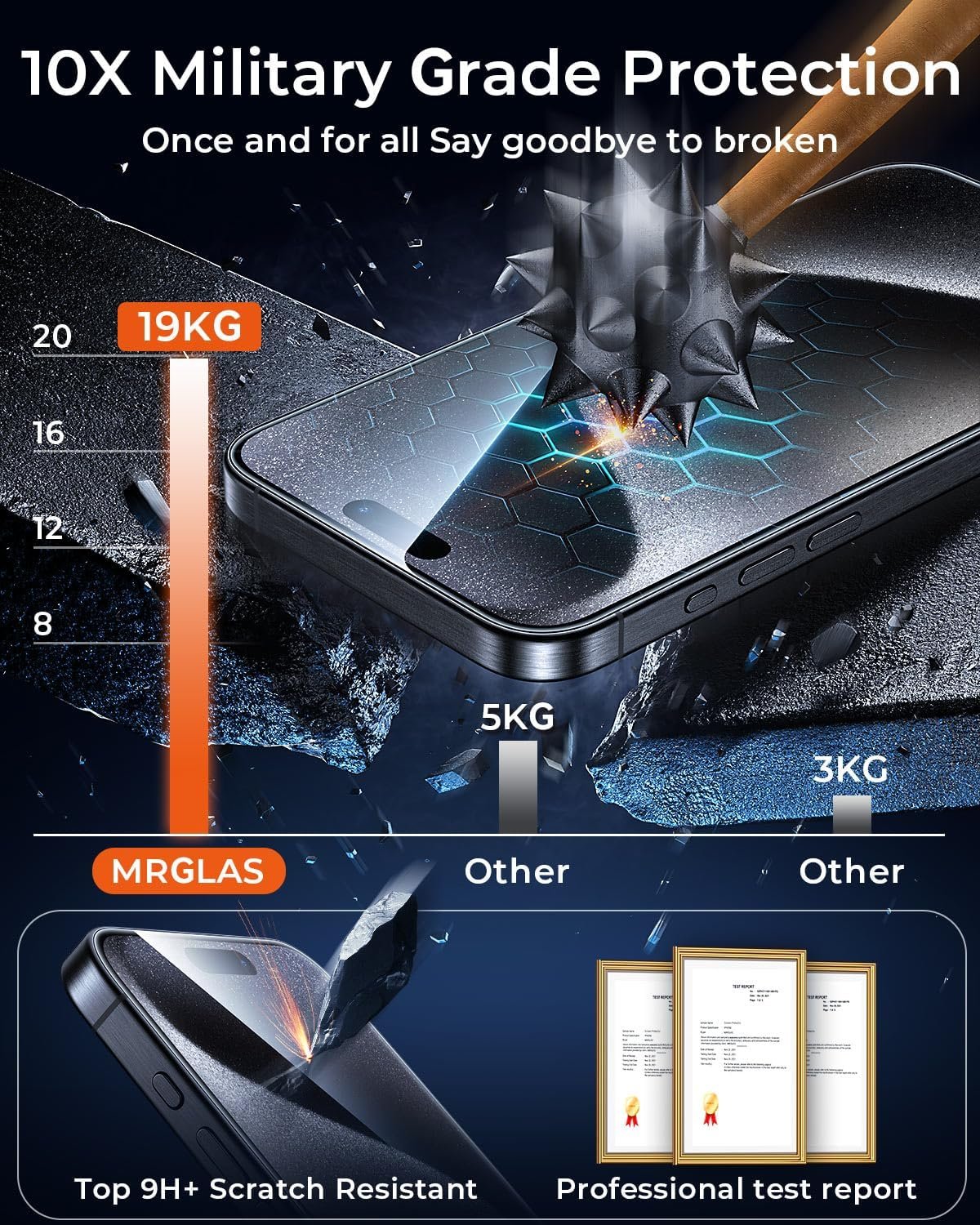 [Military Grade Protective Film] MRGLAS iPhone 15 Pro Max screen protector is made of aerospace-grade glass and newly upgraded triple ion exchange technology for added impact protection and 7-8 times stronger than traditional tempered glass protectors. The certified military-grade screen protector protects your phone screen from drops, scratches, bumps, impacts, chips and daily wear and tear.