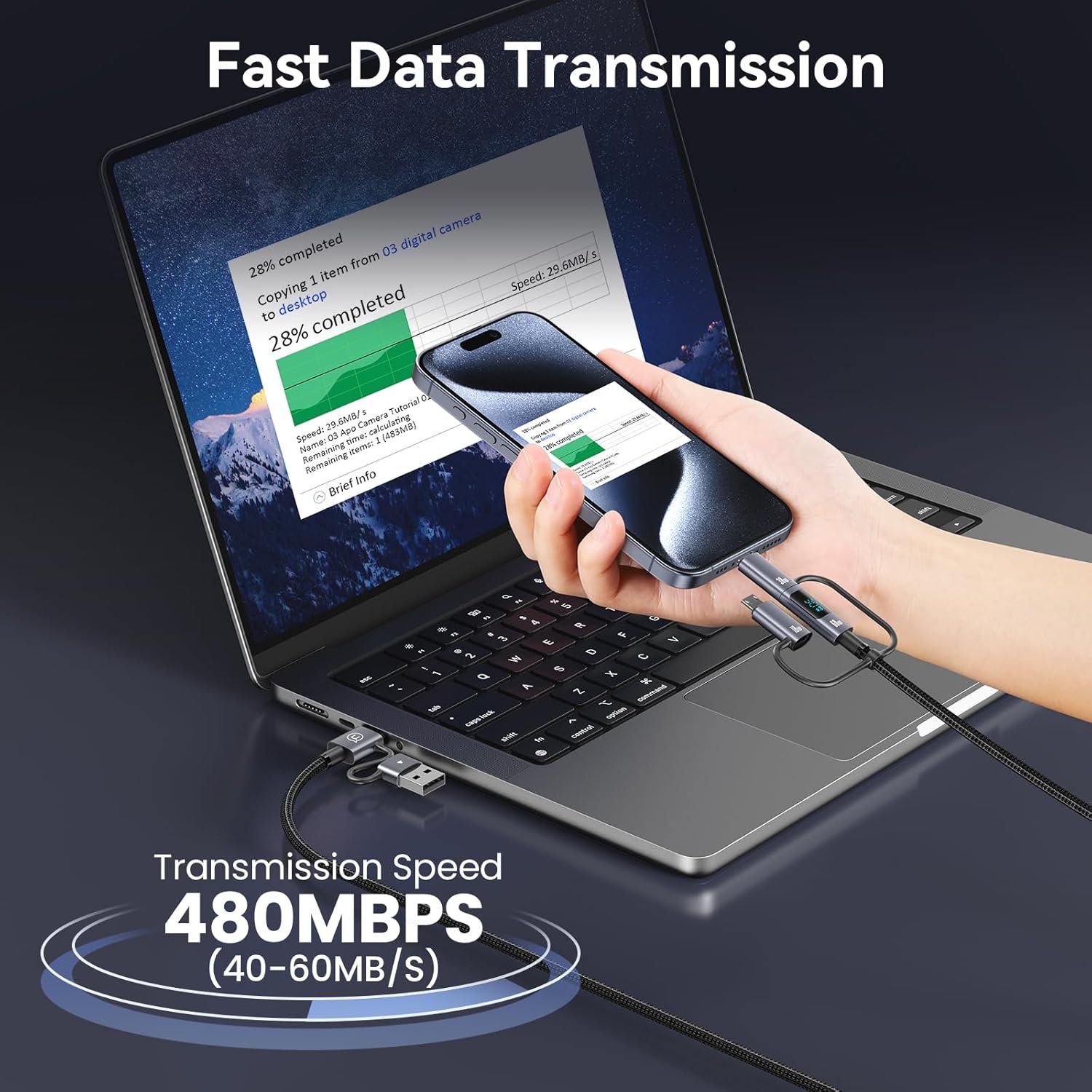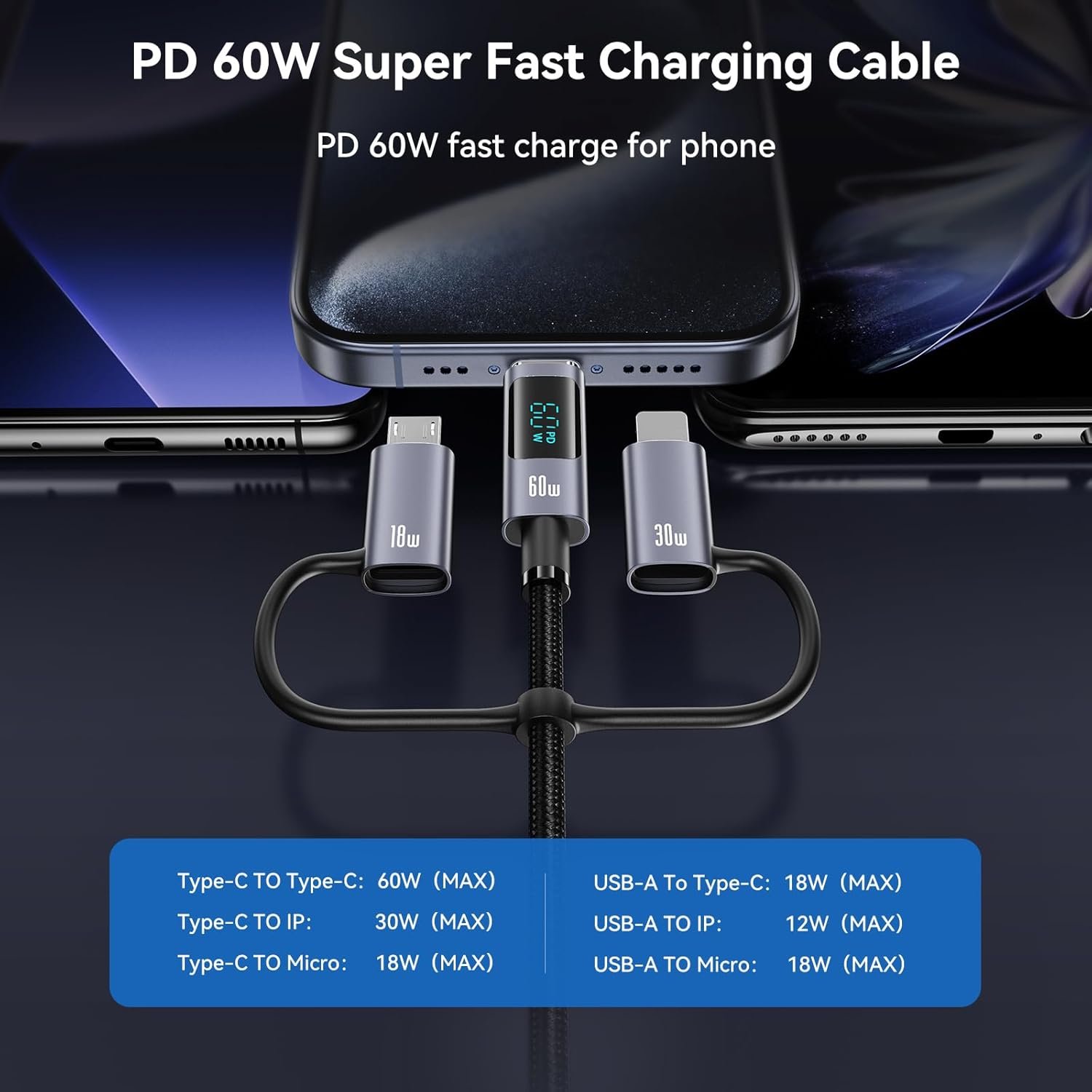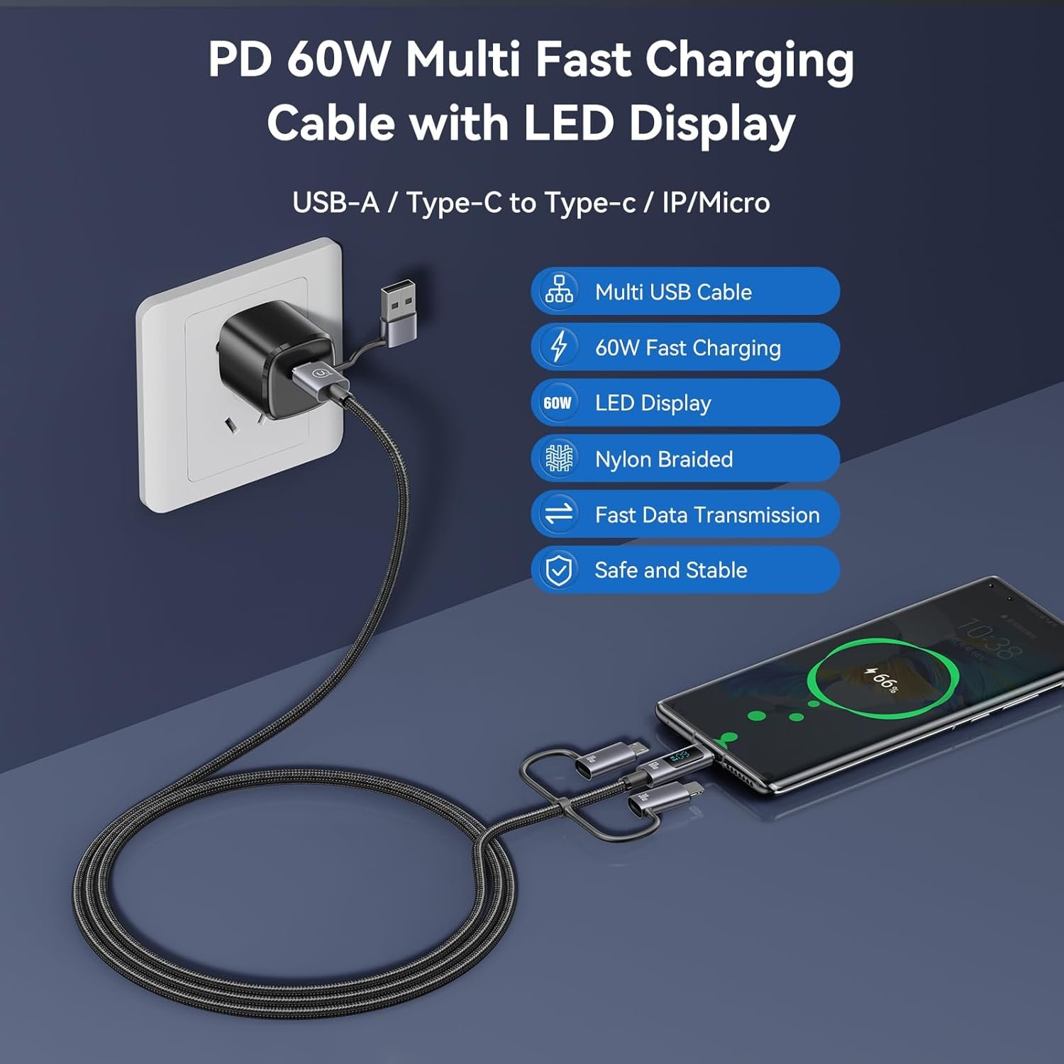 【Data transmission&fast charging】This USB C multi charging cable can charge and transfer data synchronously, with a file transfer speed of 480Mbps and a 1G file transfer time of only 30 seconds. This multi charging cable has a high-definition LED display screen and real-time monitoring of charging power. The speed of charging for this multi charging cable can be seen at a glance