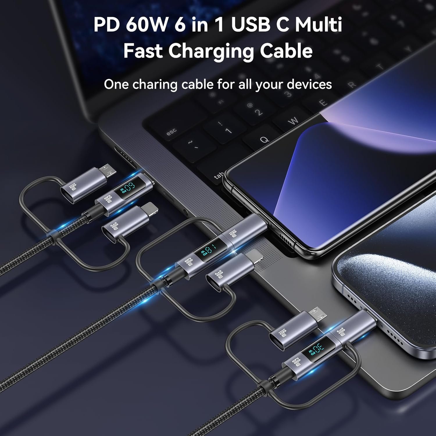 【Durable USB charging cable with display】This 6-in-1 charging cable adapter has a longer lifespan and has passed up to 30000 bending tests. This flexible soft rubber interface charging cable uses laser welding technology, which will not rust or oxidize after long-term use and is anti-static, ensuring fast charging and stable connection