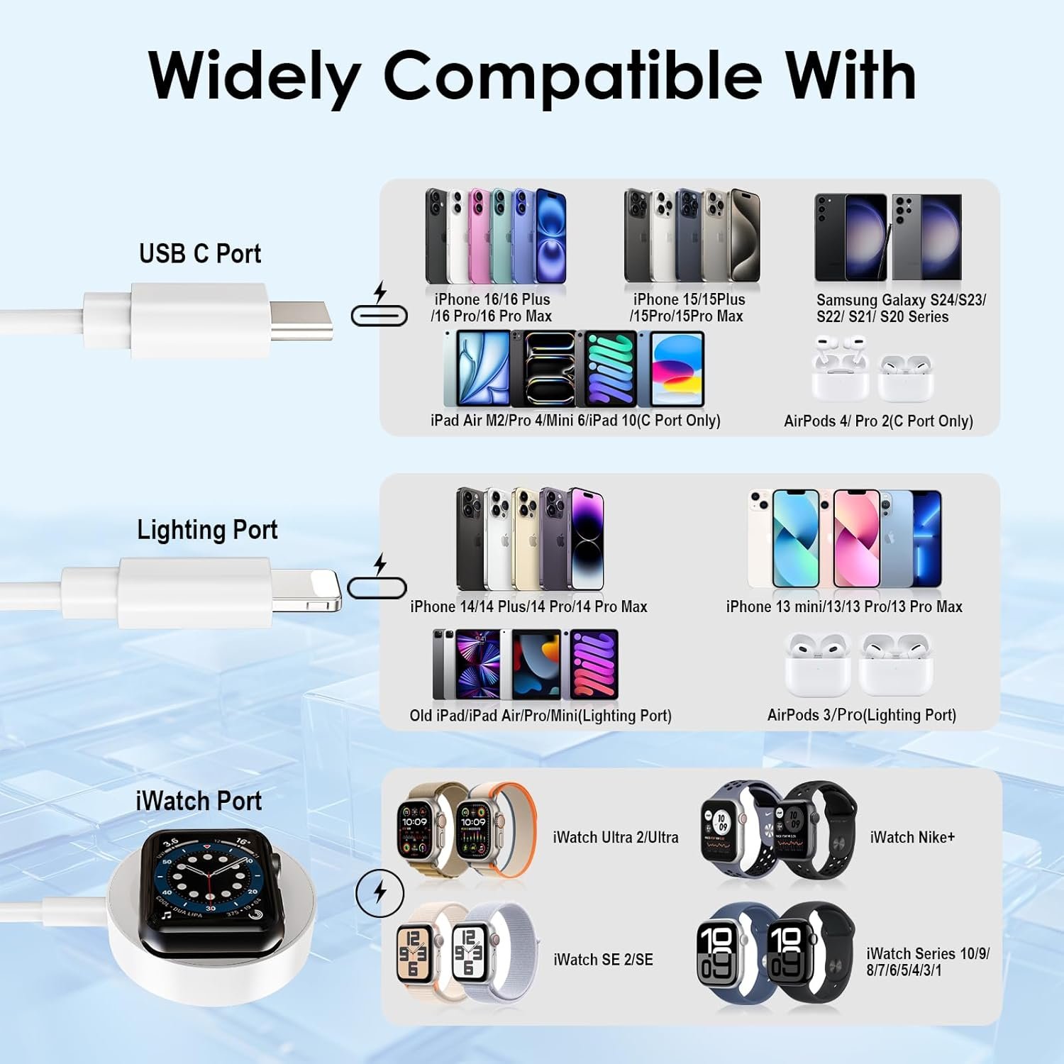 👉Charge 3 with 1 Cord: Autallgee multi charging cable is right for all your devices, has 3 output interface and 6 charging ways-USB C/A to iWatch charger & USB C/A to Lighting cable & USB C/A to Type C Cable. Magnetic iWatch Charger is compatible with all iWatch Ultra 2/Ultra/SE 2/SE/Series 10/9/8/7/6/5/4/3/2/1. The lighting port is compatible with iPhone Series SE/14/13/12/11/8/7 Pro Max Plus/5/6s Plus/3/Pro, USB C is for iPhone 16 15 Pro Max Plus/AirPods 4/Pro 2, Samsung Galaxy S24/S24+/S24 Ultra/S23/S22/S21/S20