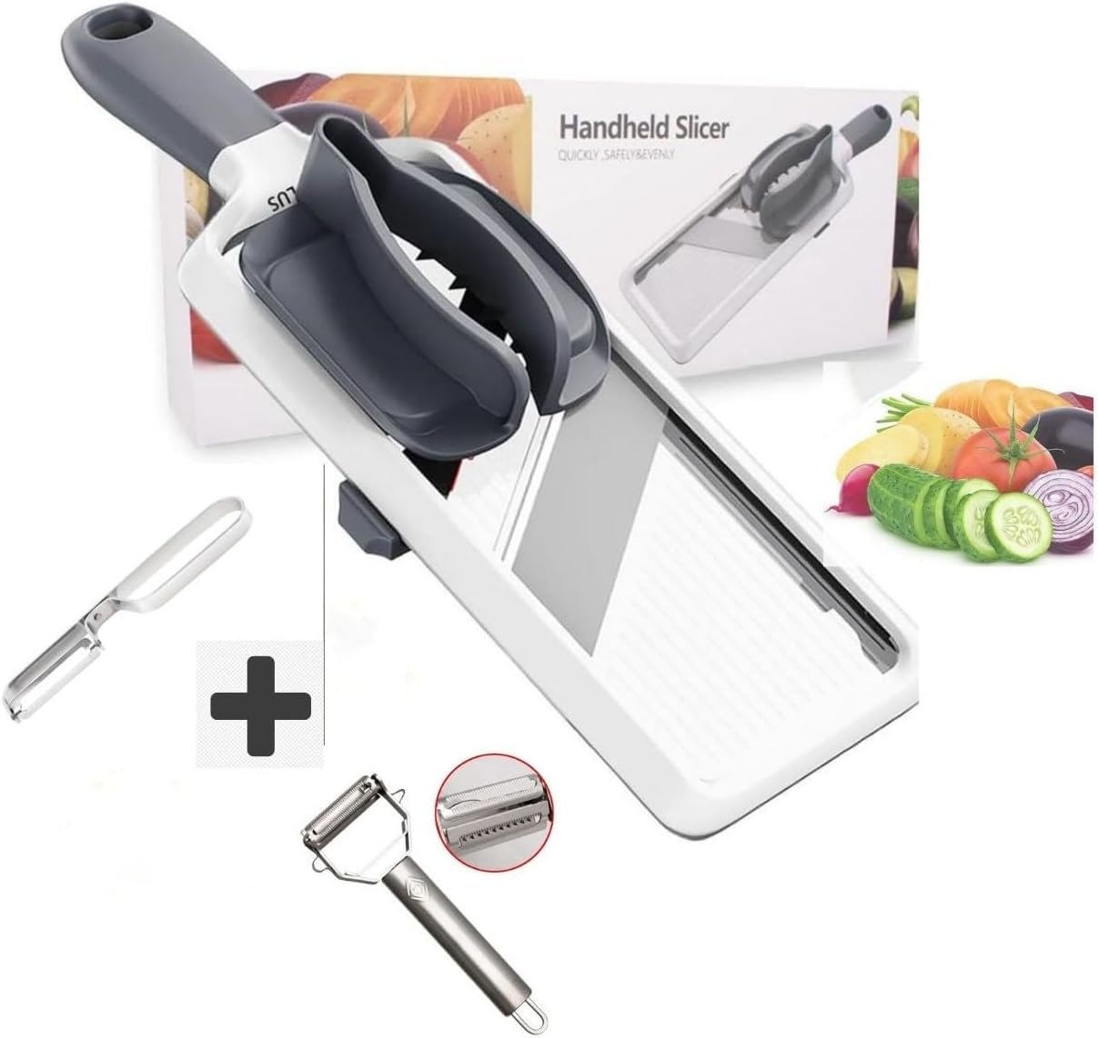 Multi-Functional Handheld Mandoline Slicer with Adjustable Stainless Steel Blade, Comfort Grip Handle, Enhanced Safety Features, Perfect for Quick and Precise Slicing of Various Vegetables.