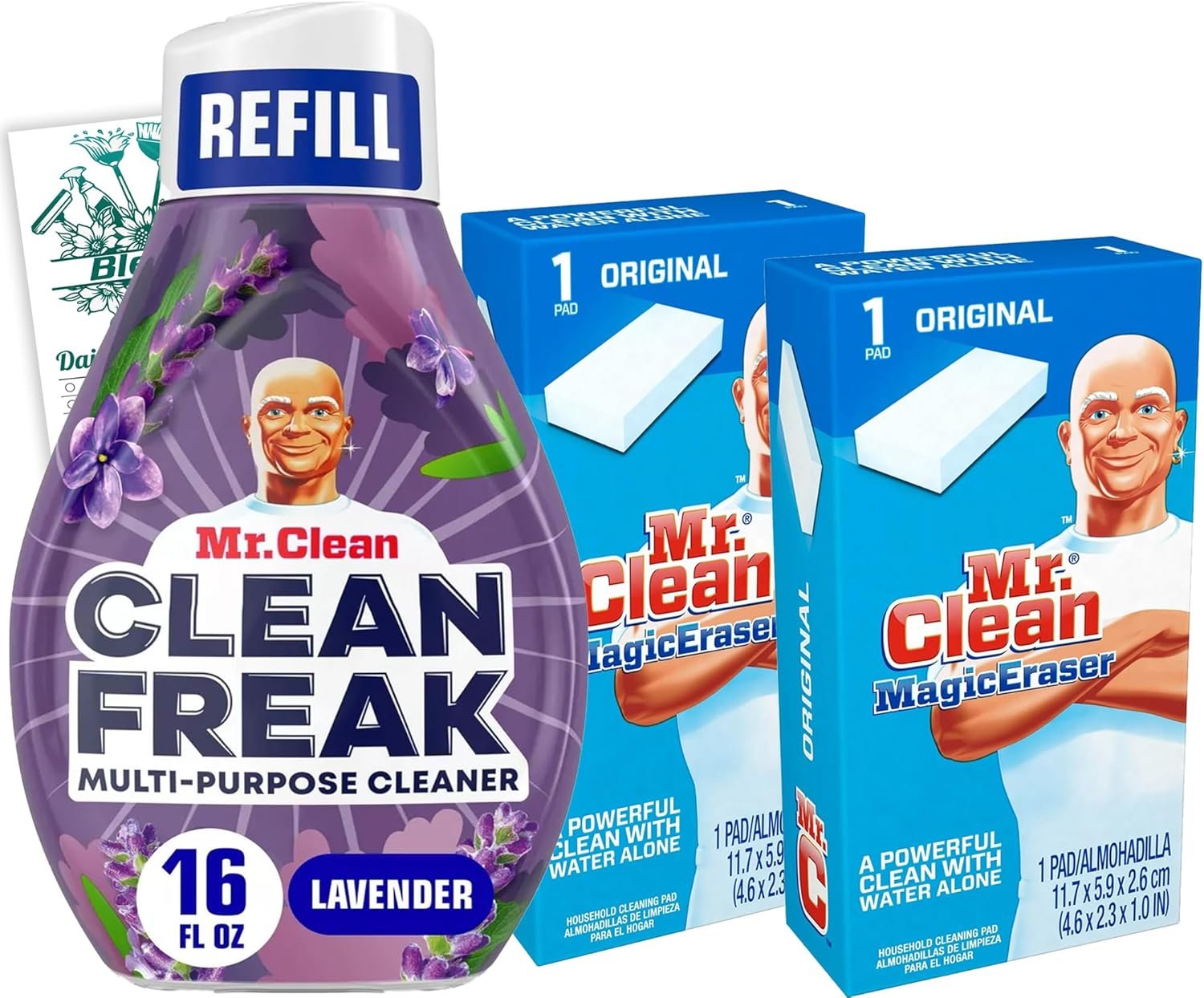 Bleam Lavender Scent Refill Cleaner Bundle with 2 Magic Erasers – a powerful combo for a fresh home. The lavender-scented cleaner effortlessly tackles grease and grime on various surfaces, while 2 Magic Erasers handle tough stains and marks on all houshold surfaces.