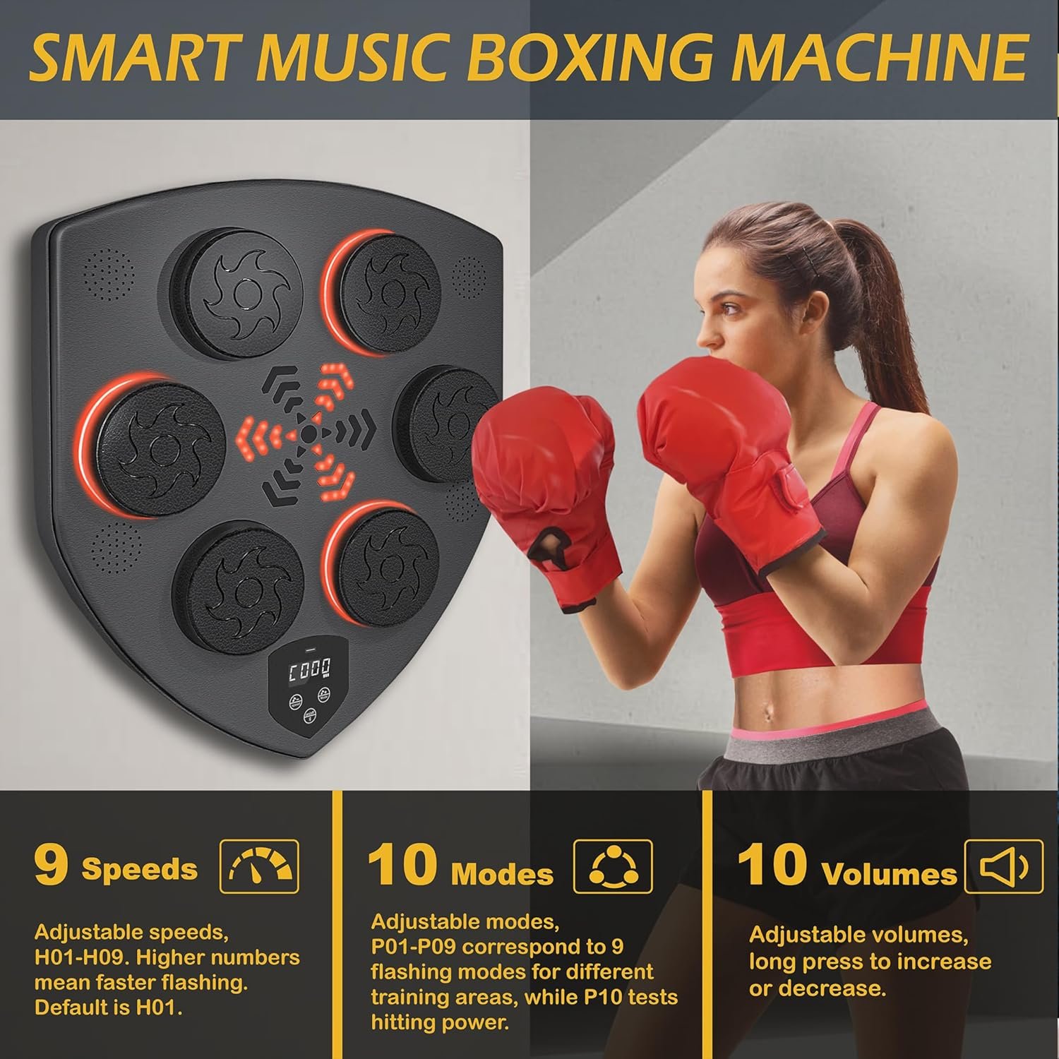 10 Adjustable Modes & 9 Speed: With 9 adjustable speeds and 10 punch modes. you can adjust the mode and speed to customize your training with smart touchscreen control, The LED lights will flash while you punch the boxing machine equipment and then the display screen shows your punch score, Once you finish, it displays your accuracy rate. This boxing music workout machine makes your workouts fun, effective, and personalized!