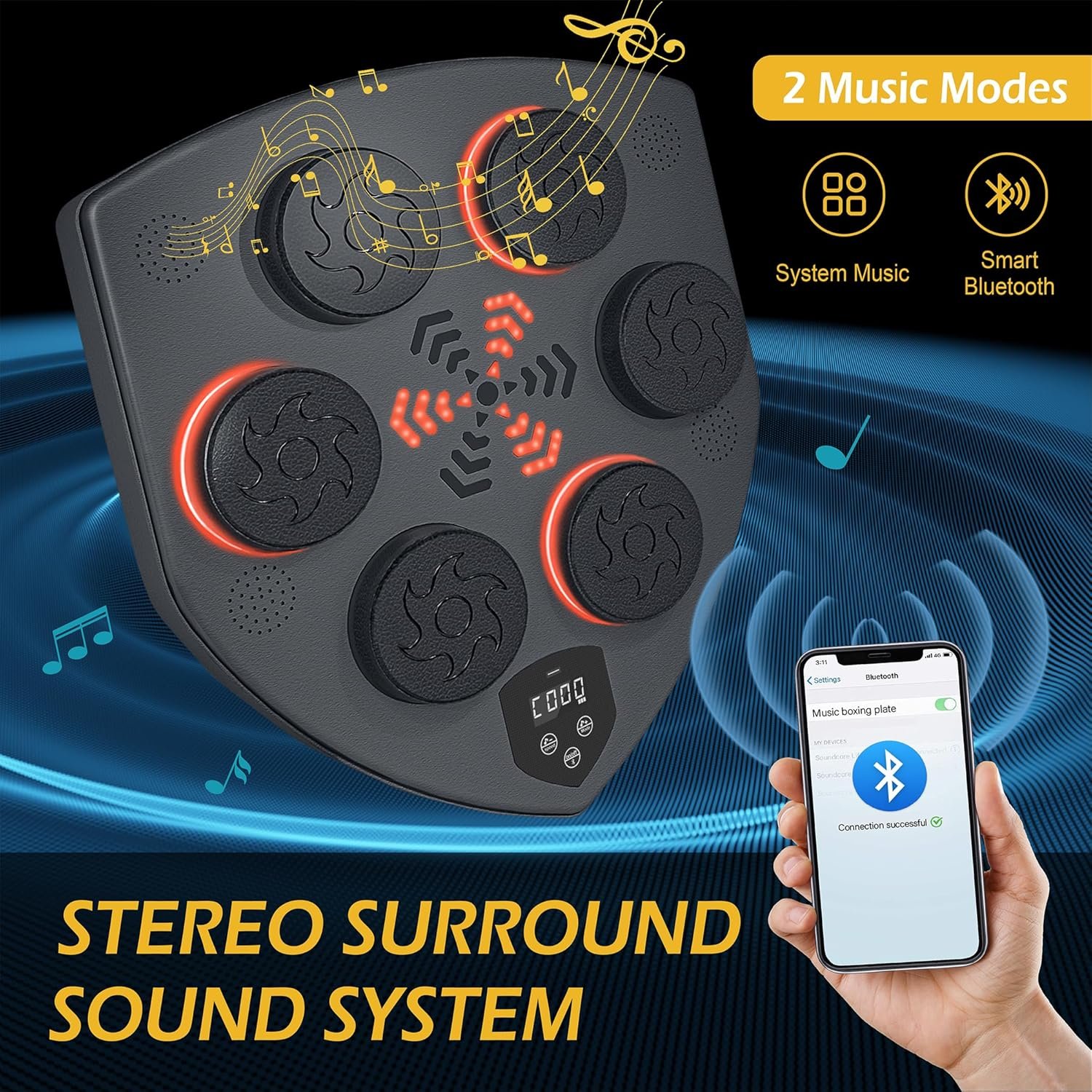 High quality stereo sound system, Bigger boxing panel, 2 music modes, 10 punching modes, 10 levels of volume adjustment, 9 levels speed adjustable, record the number of hits, light effect, test hitting power