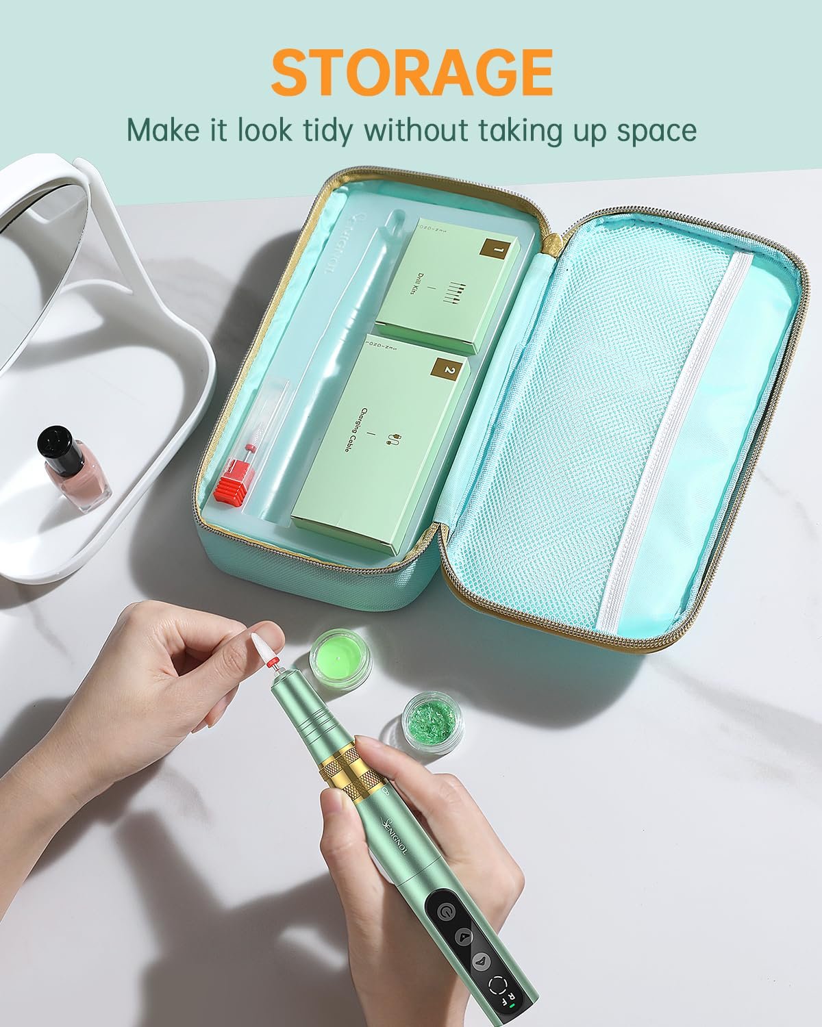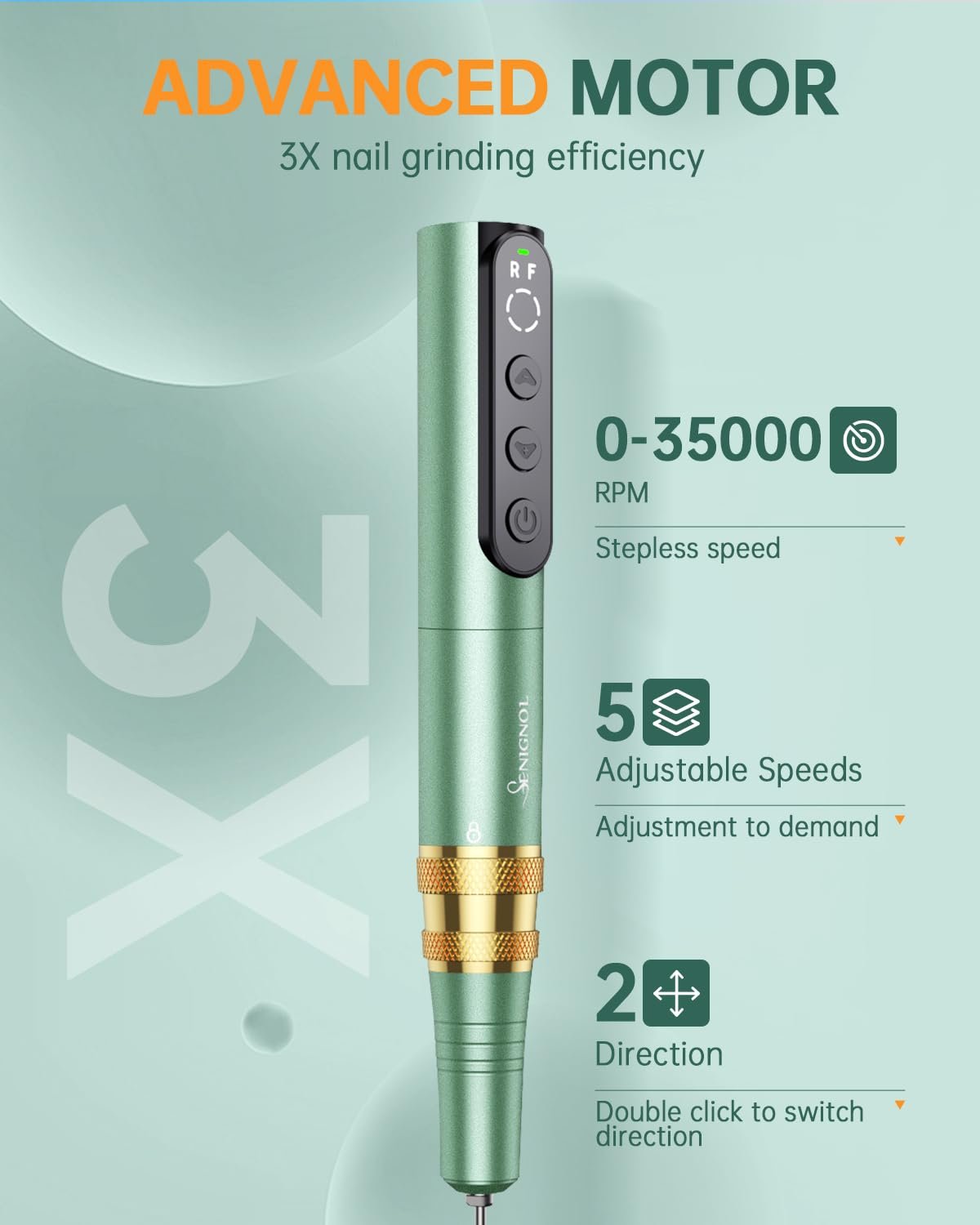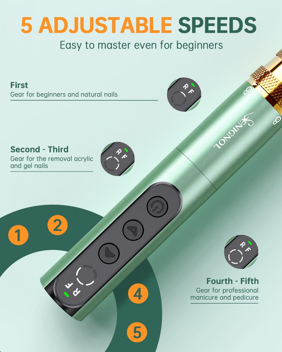 LOW NOISE AND LOW HEAT : The electric nail file has a high-tech speed bearing designed to reduce vibration and noise. So the nail dremel is in operation with low heat and low vibration The delicate aluminum alloy shell and upgraded motor ensure efficient heat dissipation, allowing you to enjoy the nail art process safely and quietly.