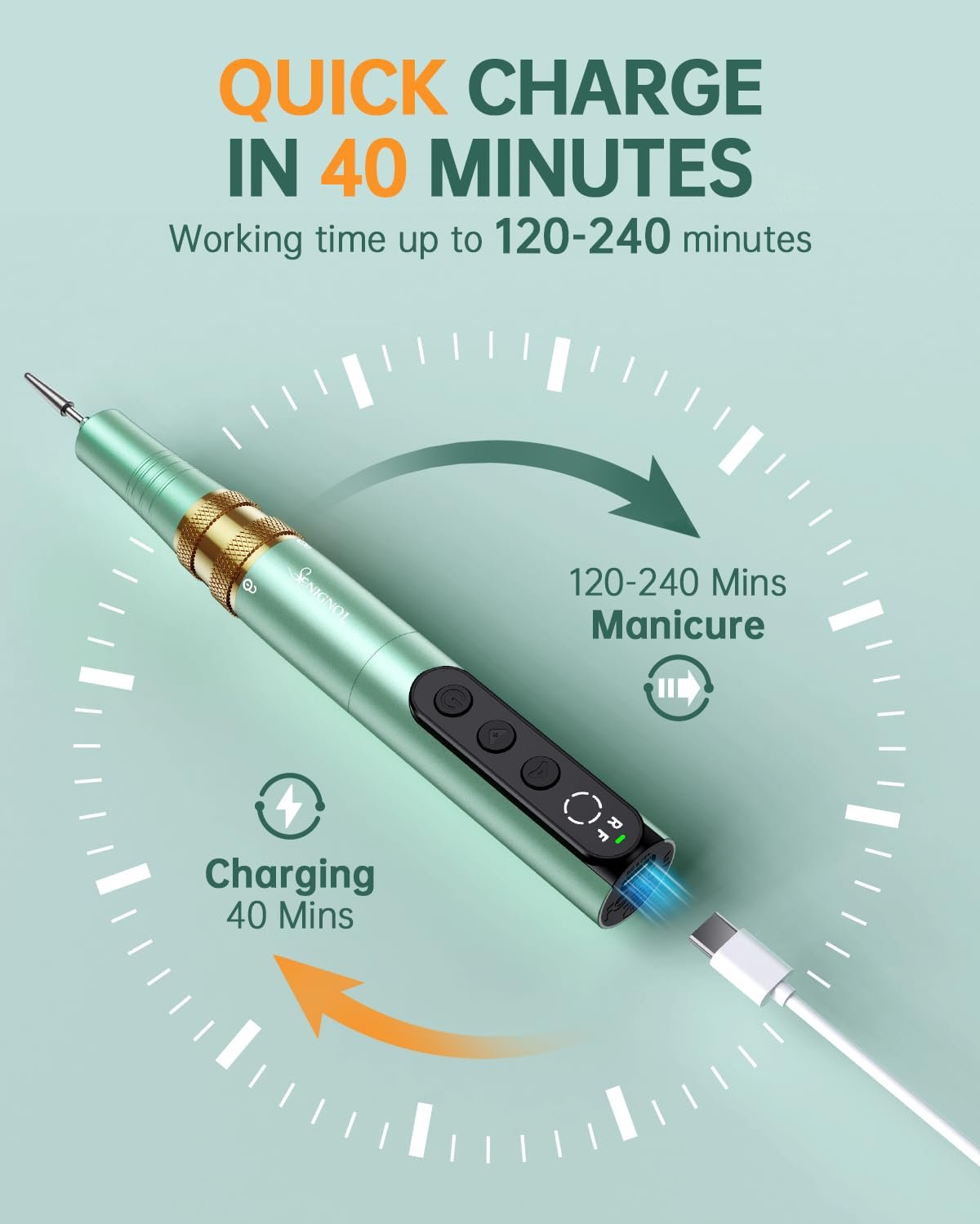 RECHARGEABLE & FAST CHARGING : This rechargeable nail drill can work for 4 hours after full charge, which means you do not need to connect to a wall or extension cord when you manicure, it can also work in the charging state. A full charge only takes 40 minutes. You can use this acrylic nail drill almost anywhere.