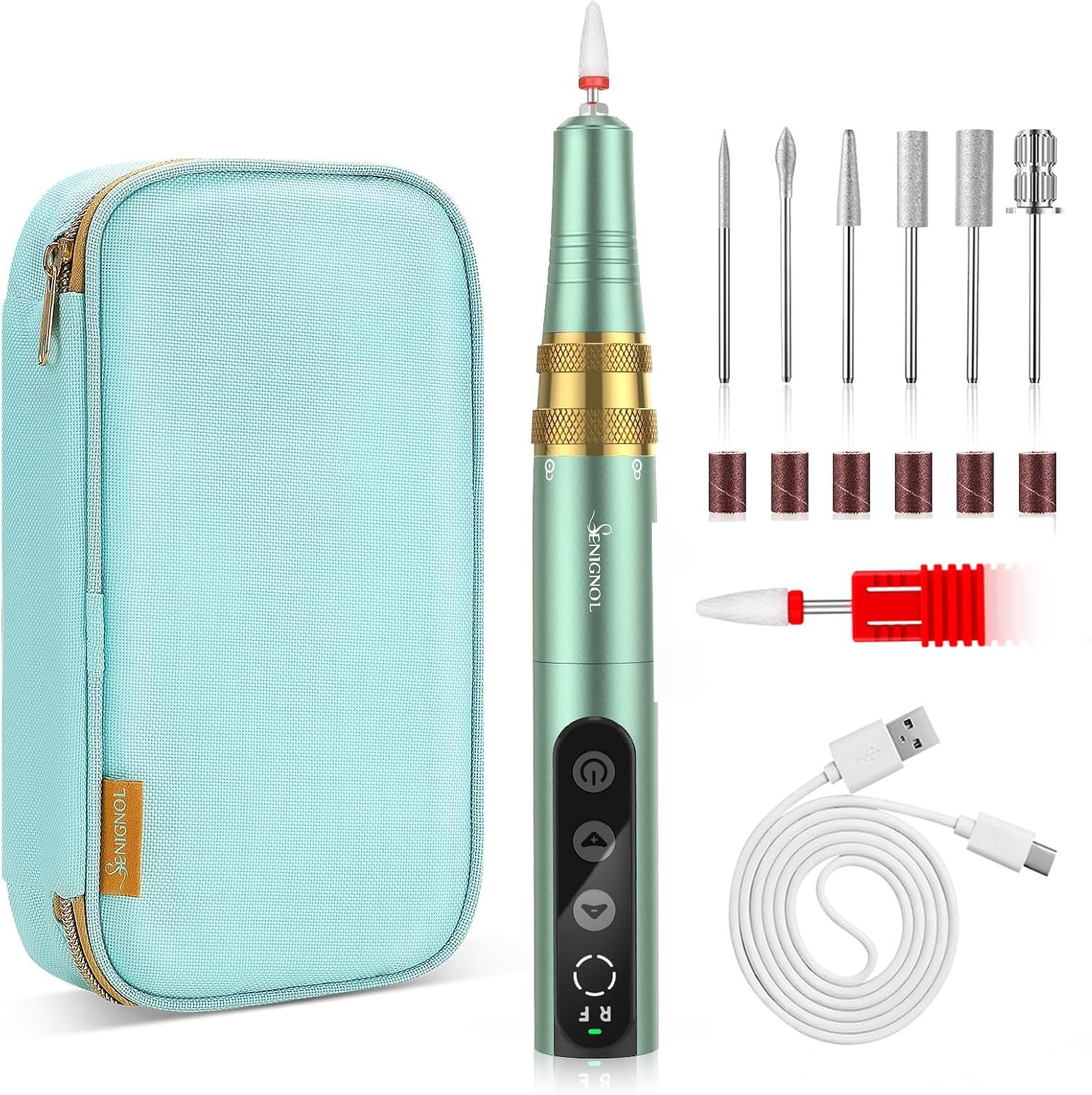 PROFESSIONAL NAIL DRILL KIT : Cordless nail drill ×1, Ceramic nail drill bit×1, Diamond nail drill bit×5, Mandrel bit x1, Sanding bands×6(compatible with 3/32”shank bits), USB cable×1, User manual×1, Nice zippered storage case×1, you can use this nail drill machine set for preparing nails, grinding, cutting, carving, polishing, removing gel nail, suitable for acrylic nails, gel nails and natural nails. Perfect for home use and nail salon.