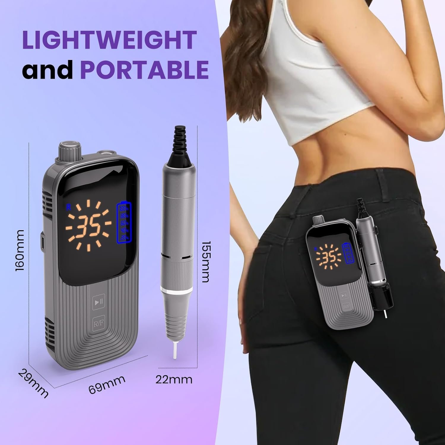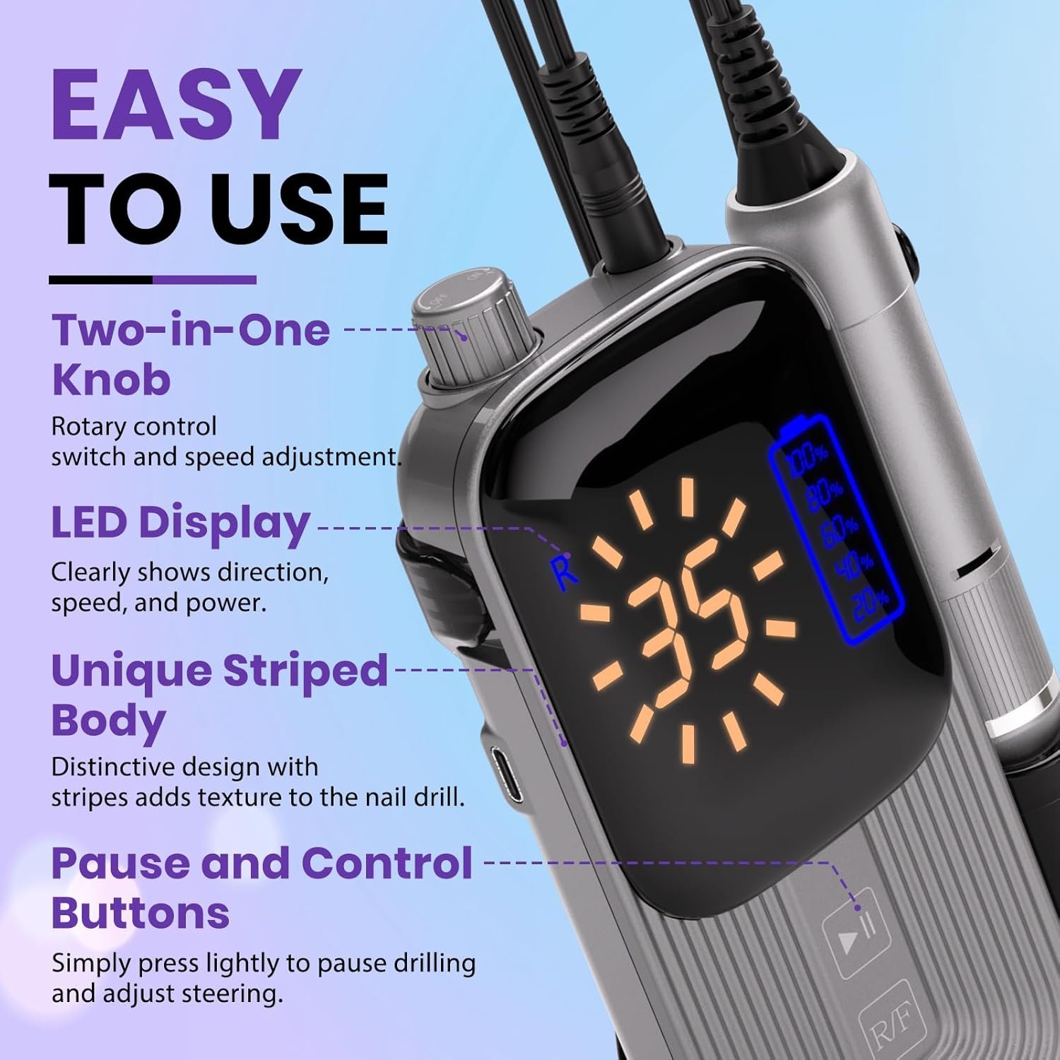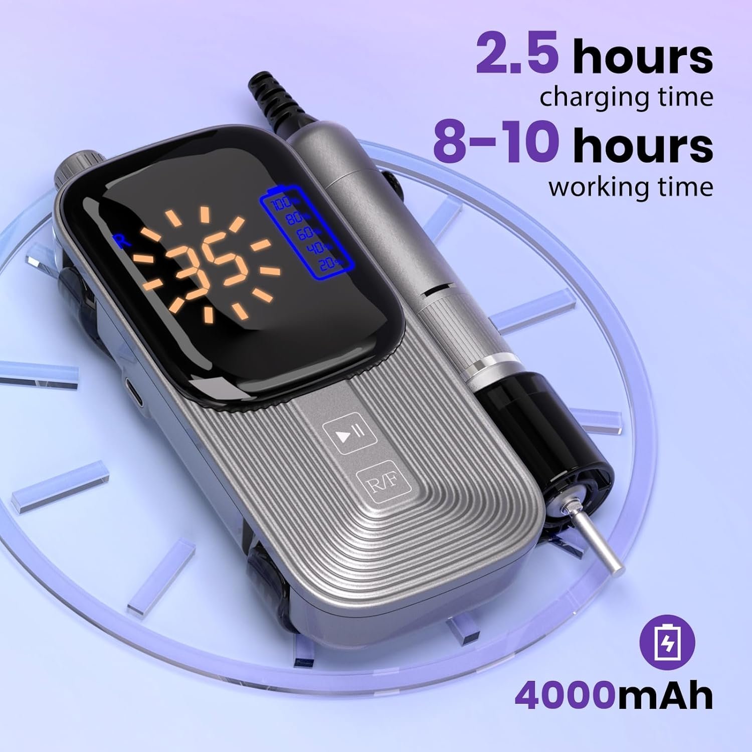 Efficient Use: Our professional nail drill come with the3.5-inch LCD and battery indicator to monitored conveniently. Enjoy 10 hours of usage on a single 2.5-hour charge via the included Type-C cable.