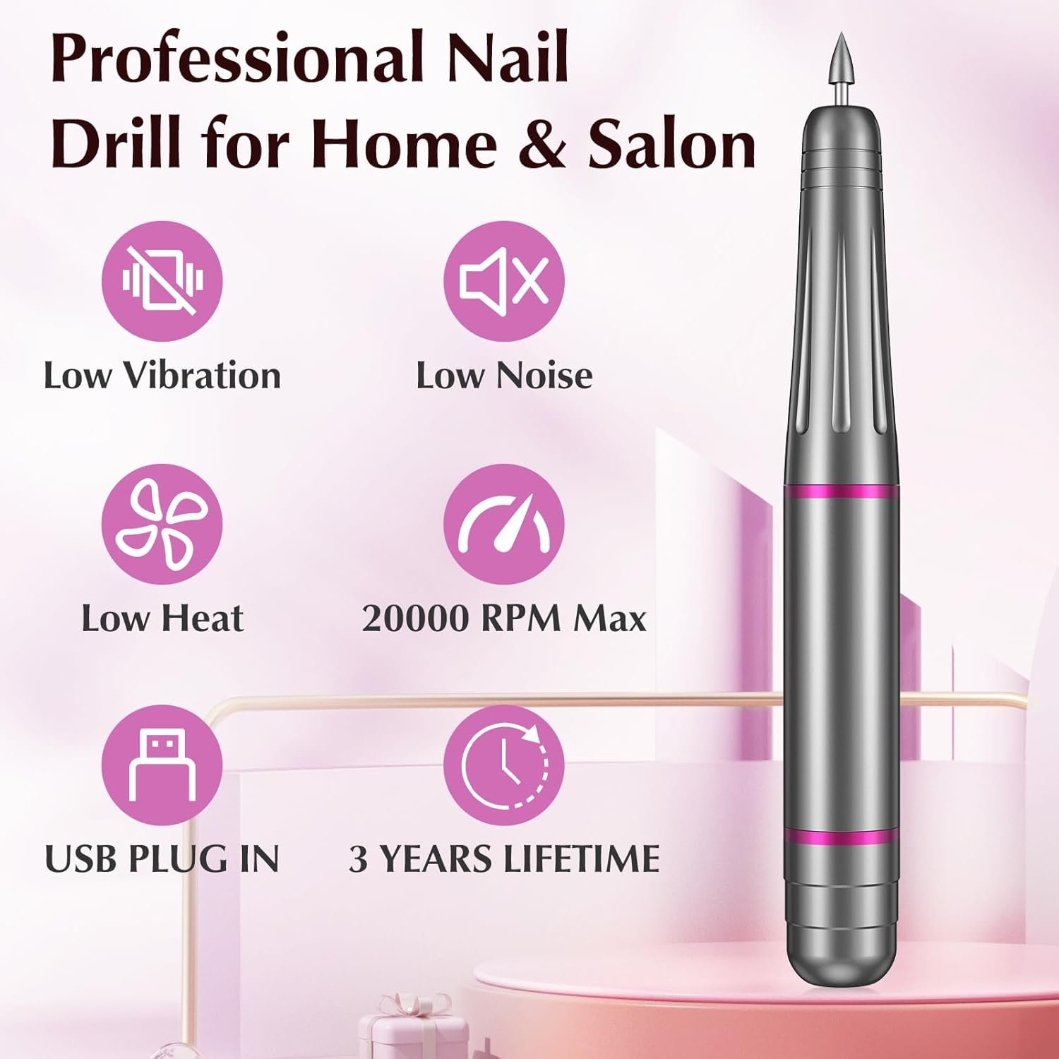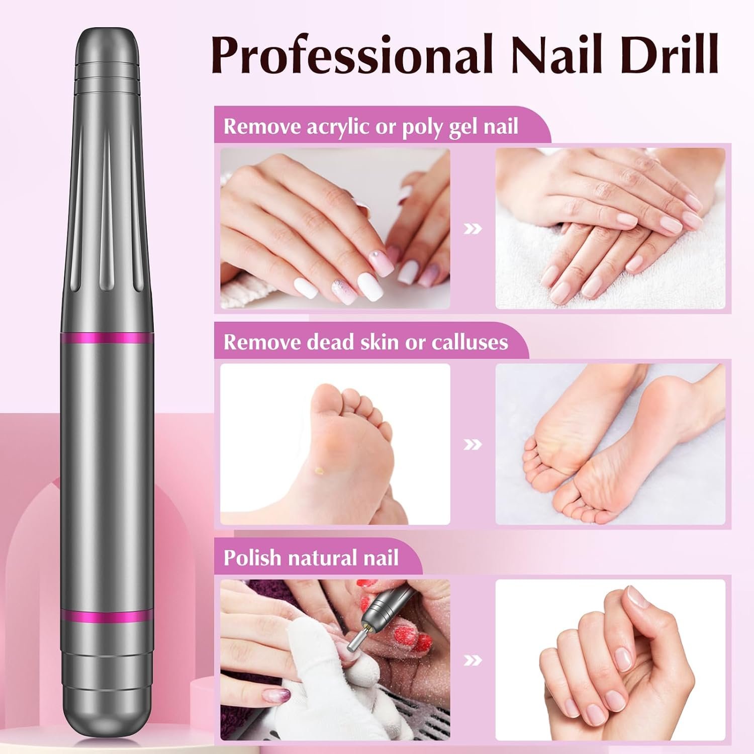 💎Safe and Versatile Nail Drill: Low heat, low noise, and low vibration design ensures a comfortable and safe experience for both the user and the client. Suitable for natural nails, acrylic nails, and gel nails, this nail drill is ideal for shaping, filing, buffing, and removing excess cuticles or calluses.