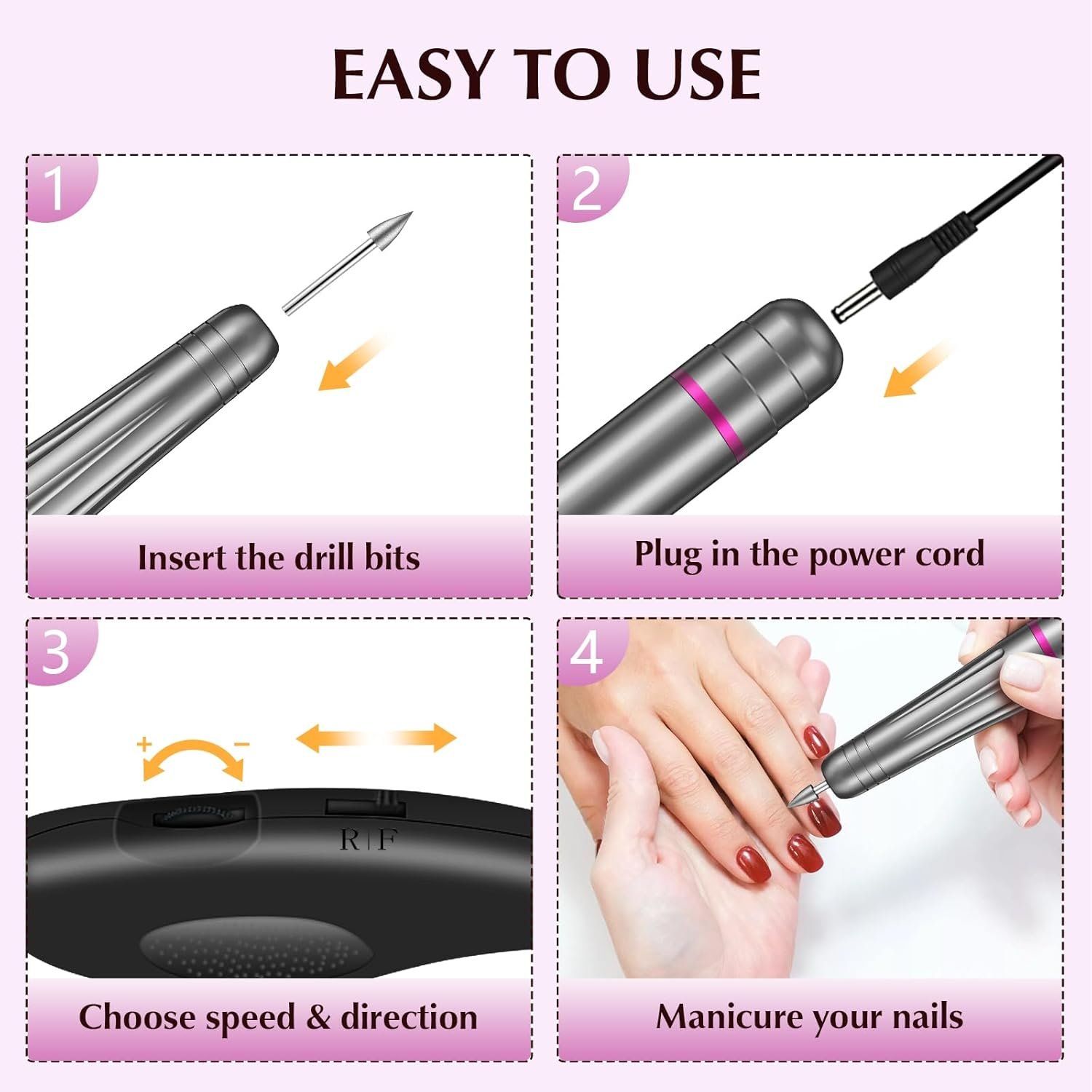 💎Customizable Speed and Direction: Stepless speed regulation of up to 20000 rpm allows for precise control and customization of nail care, while forward and reverse functionality makes it suitable for left-handed or right-handed operation.