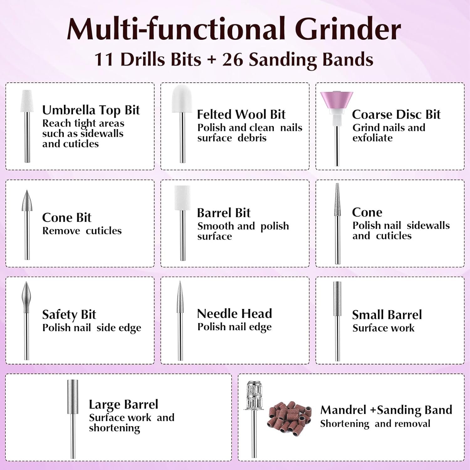 💎Multifunctional Nail Drill Kit: This nail drill set comes with 11 nail drill bits, 26 sanding bands, 1 brush, 1 glass nail file, 1 charging cable, and 1 manual, providing the tools needed for professional-quality nail care at home.