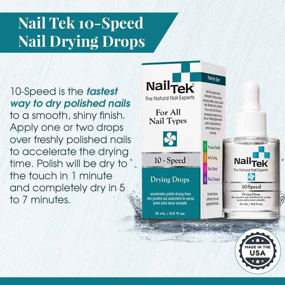 2-Pack Non-Greasy Quick-Drying Drops: Nail Tek 10-Speed polish drying drops set without greasy feel while keeping your newly polished nails safe from damage with a smooth, shiny finish. Add this to your nail care kit and never smudge your manicures again!