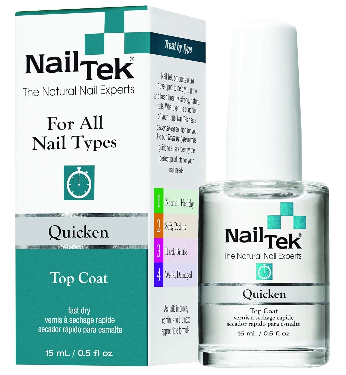 Quickly Seals In Color: Dry your polish 10 times faster with Nail Tek Quicken Top Coat! Quicken is an ultra-fast drying top coat specially formulated for natural nails, preventing nail polish from smudging or scratching! A way to a manicure and pedicure that lasts!