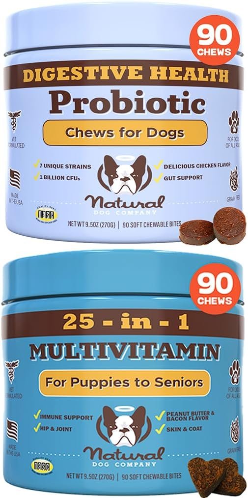 Dog Multivitamin Chews Bundle with Probiotic Support Give your furry friend the best with our comprehensive health solution: the Natural Dog Company Multivitamin and Probiotic Chews Bundle. Designed for optimal canine wellness, this bundle offers enhanced nutrient absorption, immune support, and digestive health benefits. Perfect for dogs of all ages, breeds, and sizes, our chews ensure your pet stays healthy and vibrant every day. Key Benefits: Boosted Nutrient Absorption: Our Multivitamin Chews are packed with 25 essential vitamins and minerals, including Vitamin A, Vitamin D, and Calcium. Combined with our Probiotic Chews, which contain 1 Billion CFU of 7 specific probiotic strains, your dog will experience enhanced nutrient uptake, ensuring they get the full benefit of their daily nutrition. Enhanced Immune Function: The synergistic effect of our Multivitamin and Probiotic Chews supports your dog’s immune system, helping to ward off common health issues. Ingredients like Vitamin E, Biotin, and Zinc in the Multivitamin Chews, along with beneficial bacteria in the Probiotic Chews, work together to strengthen your dog’s natural defenses. Advanced Digestive Health: Our Probiotic Chews promote a healthy gut environment, essential for proper digestion and regular bowel movements. Combined with the Multivitamin Chews, which support overall health, this bundle addresses common digestive concerns, ensuring your dog’s gut health is in top condition. Product Details: Multivitamin Chews: Contains a rich blend of vitamins and minerals such as Vitamin C, Folic Acid, and Iron. These chews support energy, joint health, and skin and coat vitality. Probiotic Chews: Features a proprietary blend of probiotic strains like Bacillus coagulans and Lactobacillus plantarum, and prebiotics like Inulin, to support gut health and nutrient absorption. Delicious Flavors: Both chews come in flavors your dog will love. The Multivitamin Chews have a peanut butter and bacon flavor