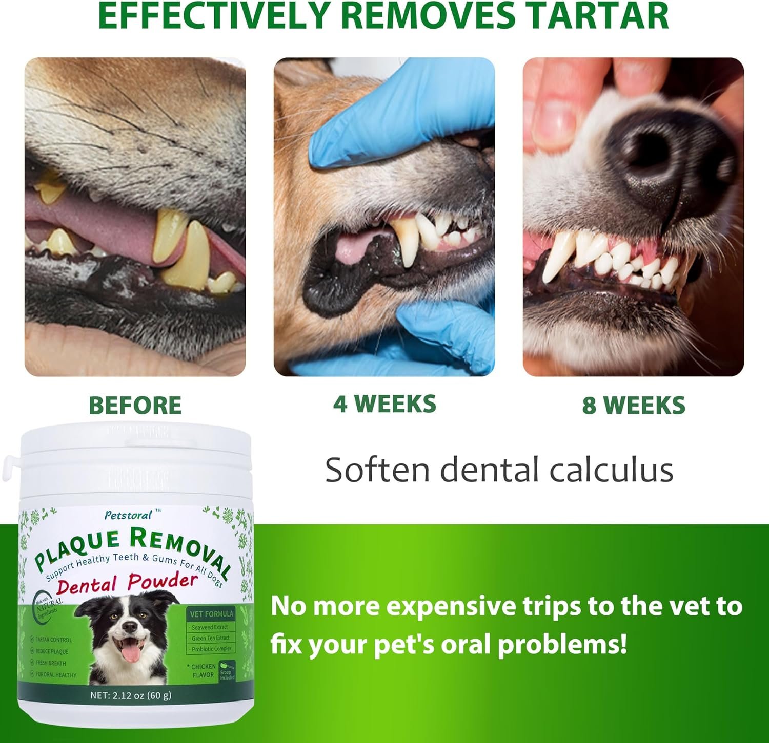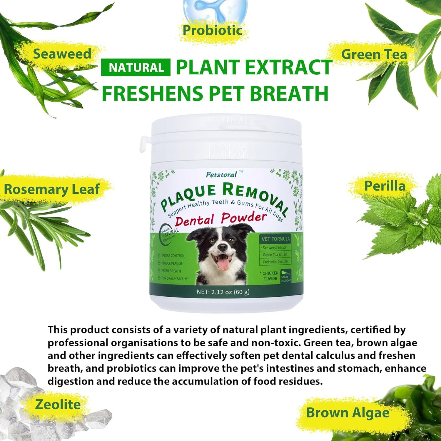 Dog Teeth Plaque and Breath Treatment – Research shows that most pets face oral issues. Our plaque removal powder dog formula not only removes plaque and tartar but also treats bad dog breath, enhancing overall pet dental health. The natural ingredients, including a proprietary probiotic for dogs, improve gastrointestinal digestion, leading to fresher dog breath.