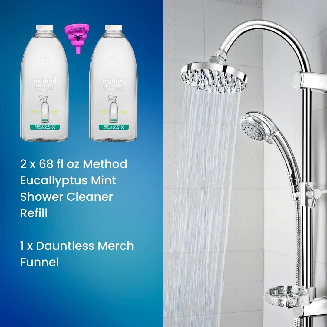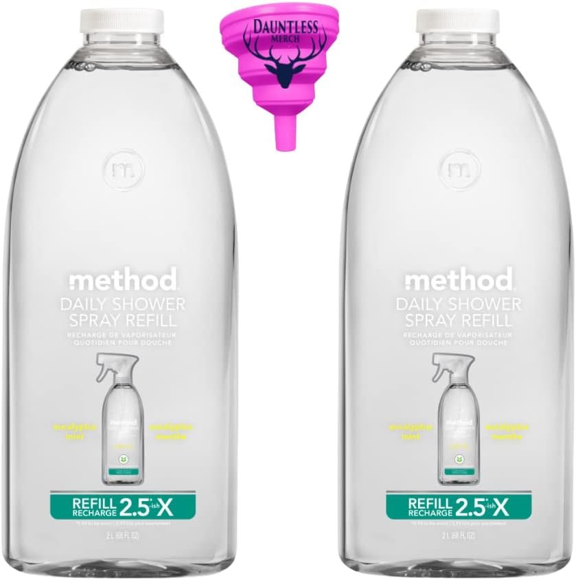 Contains (2) 68 ounce refill bottle of Method Daily Shower Cleaner, Eucalyptus Mint, and (1) Dauntless Rubber Funnel