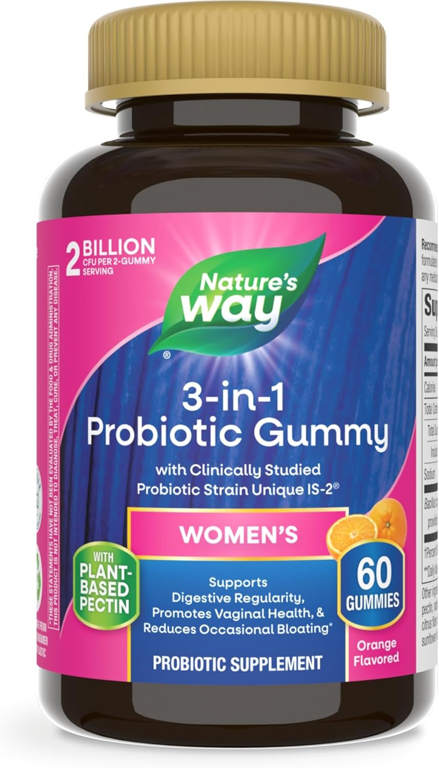 A women’s probiotic that supports your vaginal and digestive health — and in a delicious gummy form too!* Nature’s Way 3-in-1 Women’s Probiotic Gummy helps you take charge with a 3-in-1 approach to support digestive and vaginal health and reduce occasional bloating.* These delicious orange flavored gummies contain the clinically studied probiotic strain Unique IS-2® to reduce occasional bloating and digestive discomfort.* These gummies add good bacteria to the GI tract, promote digestive regularity, and help support balanced vaginal flora.* This innovative probiotic gummy makes caring for your wellness easy.