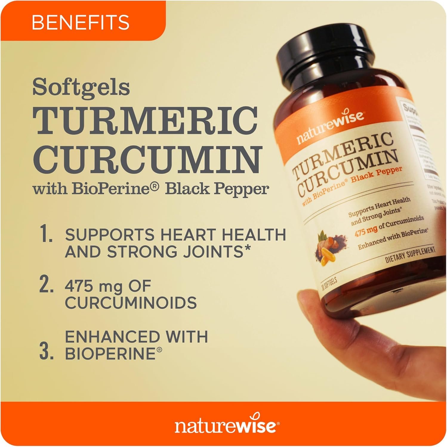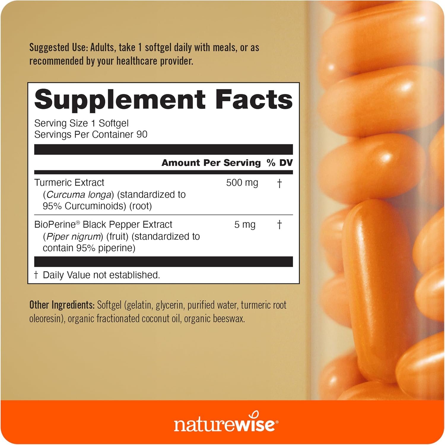 NatureWise Turmeric Curcumin Softgels are designed for proper and superior absorption. This one-per-day formula makes taking turmeric supplements much easier. Our turmeric softgel contains a potent turmeric extract that has been standardized to 95% curcuminoids, the good nutrients found in turmeric, to deliver the benefits of this root. This turmeric supplement delivers an extra strength dose of turmeric curcumin with 500mg of turmeric extract in every pill, which equates to 475mg of curcuminoids. Enhanced with BioPerine® black pepper extract, this formula has enhanced bioavailability for better absorption of curcumin. BioPerine®, a patented black pepper extract, has been tested by several clinical studies that produced results supporting its ability to aid nutrient absorption, particularly of curcuminoids.* Every softgel pill delivers 475 mg of curcuminoids to support your joint health.* Curcumin is a beneficial natural compound found in turmeric root, responsible for giving the spice its distinctive yellow color. Long used in traditional Ayurvedic herbal remedies, curcumin can provide healthy joint support to encourage comfortable daily movement.* NatureWise Turmeric Curcumin uses a clean turmeric extract with no GMOs. This product is gluten-free, clean, and third-party tested for purity. This product does not contain wheat, gluten, eggs, dairy, soy, peanuts, fish, or shellfish.