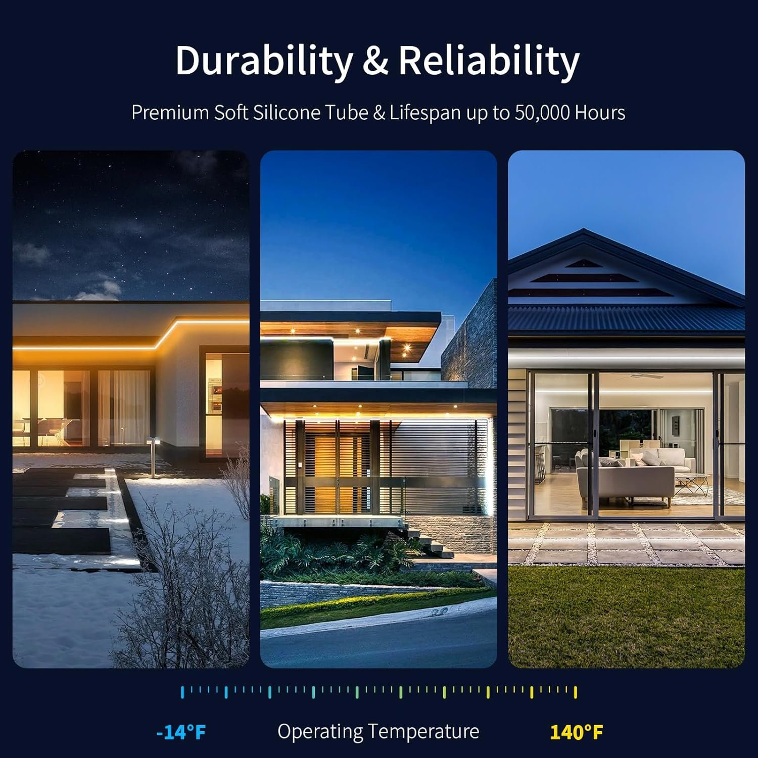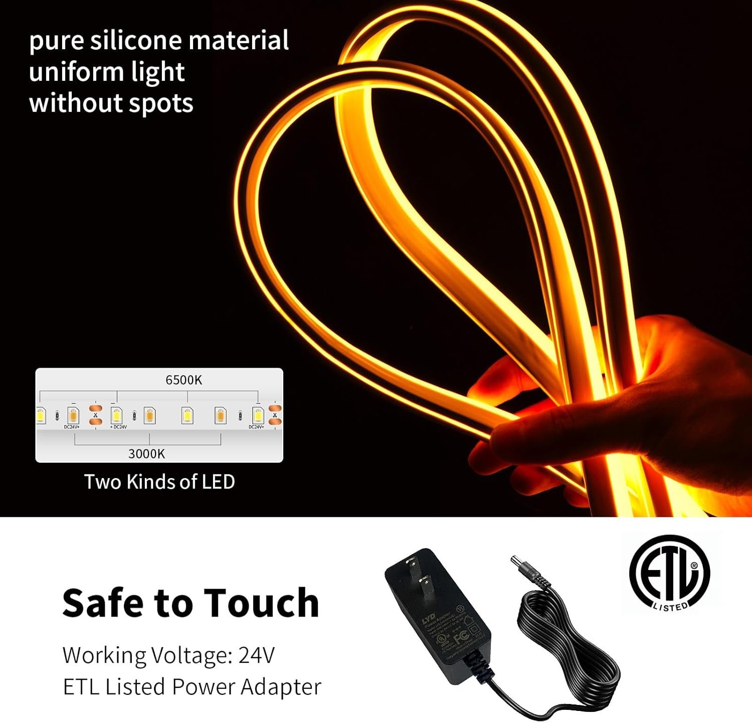 【24V Safe&Durable&IP67 Waterproof】The light rope is 24v low voltage which means it is touchable without danger and ensures energy efficiency and long-lasting performance. ETL listed power adapter ensures your safety during usage. The neon led strip lights are made of double sized PCB board, covering with pure silicone material, using silicone thermal co-extrusion production process, making the led light has strong weather resistance, suitable for various environments.