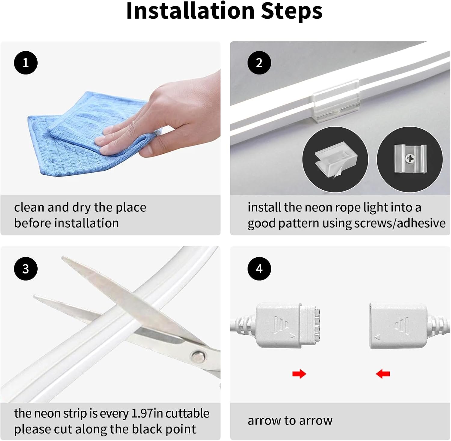 【Easy Installation&Cuttable&Flexible&Complete Kit】the neon lights indoor can be installed using either clips with screws or with adhesive. The neon lights for outside is every 1.97in cuttable. It is so flexible that you can form the rope lights into any shapes. You will get a complete kit to meet all your needs include 20ft neon lights*1, rf remote*1, 3-key controller*1, clips with adhesive and screws*12, user manual*1, cap*1.