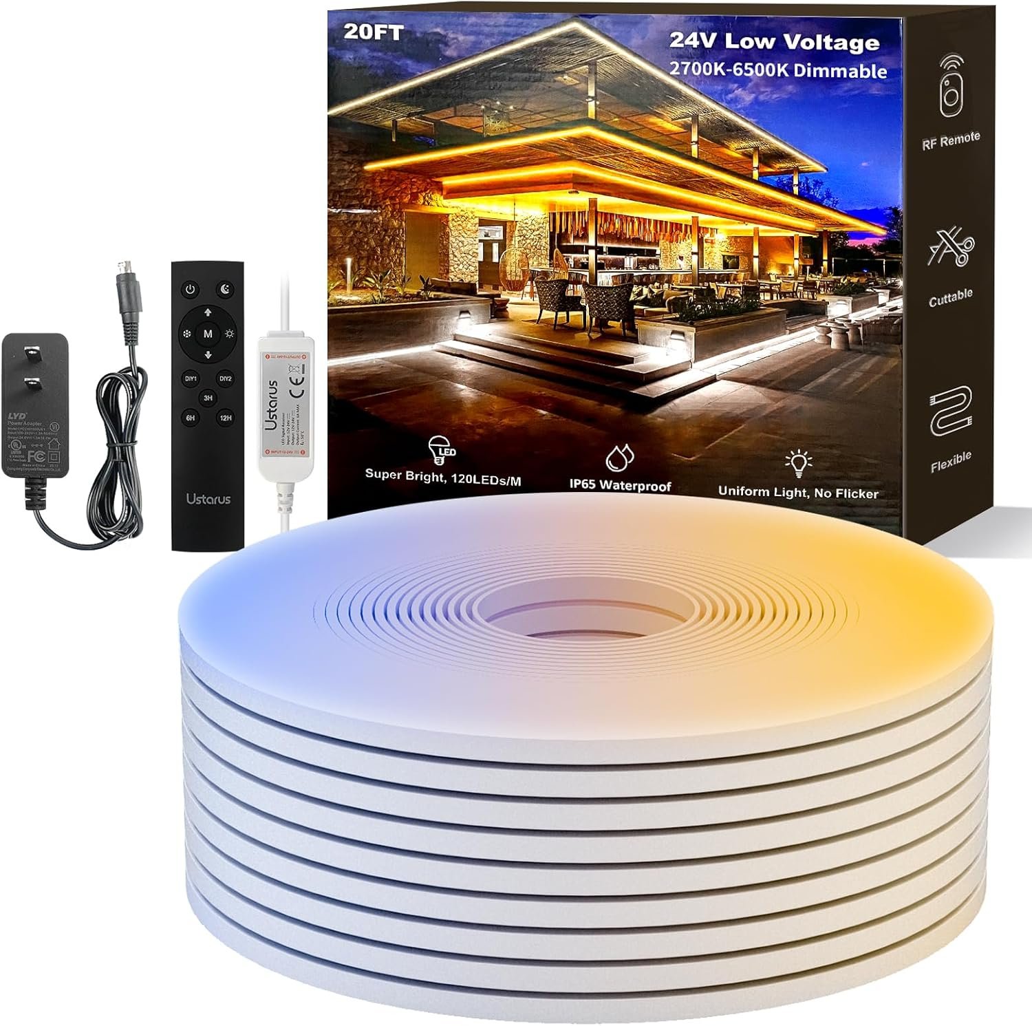【20FT Neon LED Strip&Dimmable&Timer&Memory Function】Ustarus led rope lights are 20ft long. Using 720 premium super bright leds, the led wall lights are uniform, without any spots and flickers. The brightness of the neon light strip is adjustable. The light rope can be turned off in 3/6/12 hours. Memory function is also available. The neon led rope has a lifespan of over 30,000 hours.